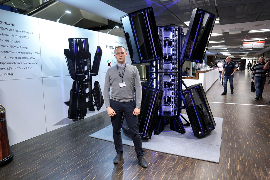 - Mam wrażenie, że ten, ważący 1,5 t i kosztujący 7 mln zł wzmacniacz Pivetta Opera Only powstał tylko po to, aby o nim pisać. Na wystawie stał w na holu. Na zdjęciu, dla porównania jego rozmiarów, naczelny działu News naszego magazynu, Bartosz Pacuła.
