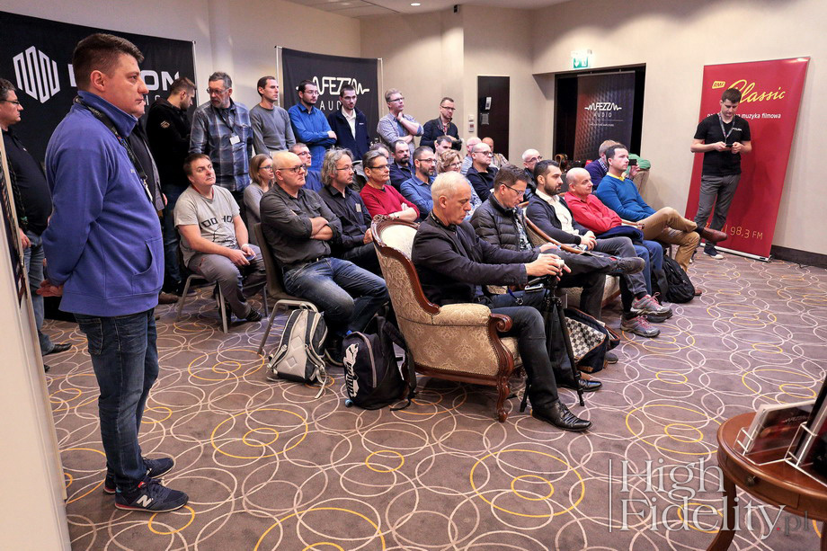 Adam Mokrzycki, założyciel imprezy i jej dyrektor, trzyma w rękach czekan, który otrzymał właśnie od swoich współpracowników, aby „wspinał się jeszcze wyżej”. Po sukcesie tegorocznej, 21. edycji na 20-lecie imprezy, będzie to prawdziwe wyzwanie. Prezent chyba się spodobał – jego miłością jest wspinaczka wysokogórska. W każdym razie zaczynam od liczb, ponieważ wystawa wyszła poza audiofilski krąg, stała się imprezą masową przeznaczoną dla szerokiego przekroju społeczeństwa, nawet dla tych, którzy nie słuchają muzyki na co dzień, a chcą się jedynie zorientować w aktualnych trendach. Pomocny w jej rozwoju okazał się podział na trzy hotele, pozwalający jej zachować tożsamość – ostatecznie to impreza strictle audiofilska. Na PGE Narodowy mamy teraz przestrzeń bardziej lafjstajlową, o luźniejszej atmosferze. Nie znaczy to, że nie ma tam drogich, poważnych systemów – wprost przeciwnie, są! Większość najdroższych produktów można znaleźć właśnie tam. Mówię jednak o ludziach, którzy tam przychodzą i ich nastawieniu. To bardziej zwiedzający niż uczestnicy. Raczej dopiero poznający tę branżę niż starzy wyjadacze. Normalsi. W hotelu Radisson Blu Sobieski wystawiają się z kolei firmy bardziej zorientowane na brać audiofilską, często niewielkie, dopiero startujące lub absolutnie niszowe. A w hotelu Golden Tulip mamy kilka wyselekcjonowanych firm, które od lat przygotowują rozbudowane prezentacje. Tam też są największe sale. Na konferencji prasowej o której wspomniałem na początku Adam podał podstawowe informacje dotyczące imprezy od jego strony, poza liczbą zwiedzających: