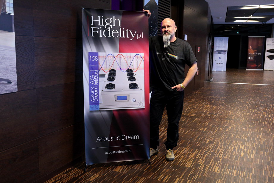 - Pan Marek Piątek, szef i konstruktor firmy Acoustic Dream obok czerwcowej okładki „High Fidelity”.