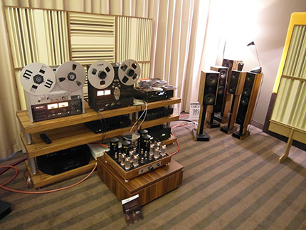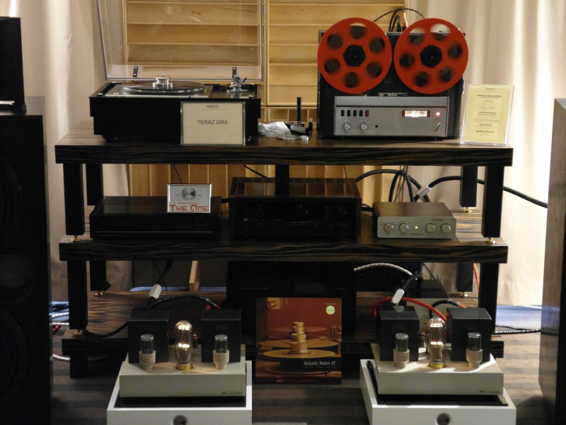 A oto i wspomniany Nottingham Analog przecudnej urody (zdjęcie słabe, ale był cały czas oblegany) Następnie krakowsko-niepołomicki Audioform pana Tomasza Kursy, producent głośników i nie tylko – produkuje też ustroje akustyczne – m.in. te, które można było obejrzeć na wystawie, ale miał też podobno coś wspólnego z projektem stolików na których grał sprzęt w pokoju Audioformu. To właśnie Pan Tomasz zaszczepił mi miłość do szpuli. Kilka magnetofonów z jego bogatej kolekcji grało przez jakiś czas u mnie w domu, no i wtedy okazało się, że podział źródeł dźwięku jest taki: gdzieś tam, bardzo, bardzo wysoko jest szpula, potem długo, długo nic, a potem to już mogą się szanowni Audiofile nawzajem przekonywać czy lepsza jest płyta większa i czarna, czy mniejsza i srebrna lub złota, a może w ogóle najlepsza jest kaseta albo plik? Wracając do tego jak grały Audioformy – grały po prostu świetnie, wciągająco, z dużym rozmachem i świetną prezentacją sceny we wszystkich trzech wymiarach. Nie wiem, jak wypadły z tranzystorem, natomiast z lampą pożyczoną od Sky Audio było naprawdę super.