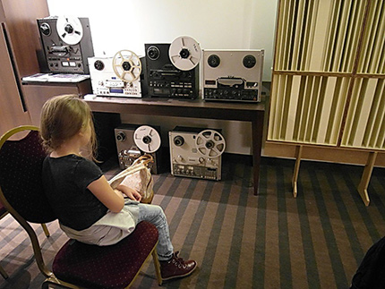Karteczka „teraz gra” stoi przy gramofonie – ale to tylko dla zmylenie przeciwnika, naprawdę grał niepozorny ReVox A77 i robił to fantastycznie Ostatni pokój, który odwiedziłem zajmowany był przez Kostasa Metaxasa. Tego Wielkiego Człowieka nie trzeba chyba przedstawiać. Fantastyczny, otwarty facet. Rozmowa oczywiście szybko skręciła (przyznaję, za moją sprawą) w stronę jego nagrań publikowanych przez MTSL i grania ze szpuli generalnie. Pozwoliłem sobie nawet na wyartykułowanie rozczarowania, że w jego pokoju niego nie kręci się żadna szpulka… Okazało się, że plan był taki żeby zagrać ze szpuli, ale upadł w zderzeniu z europejską (a konkretnie austriacką) biurokracją – sprzęt i szpule przyleciały z Australii do Wiednia, gdzie zostały zaaresztowane przez celników. Panowie uznali, że trzeba się tym podejrzanym urządzeniom i materiałom lepiej przyjrzeć. Obiecali je zwolnić w poniedziałek, zaraz po wystawie…