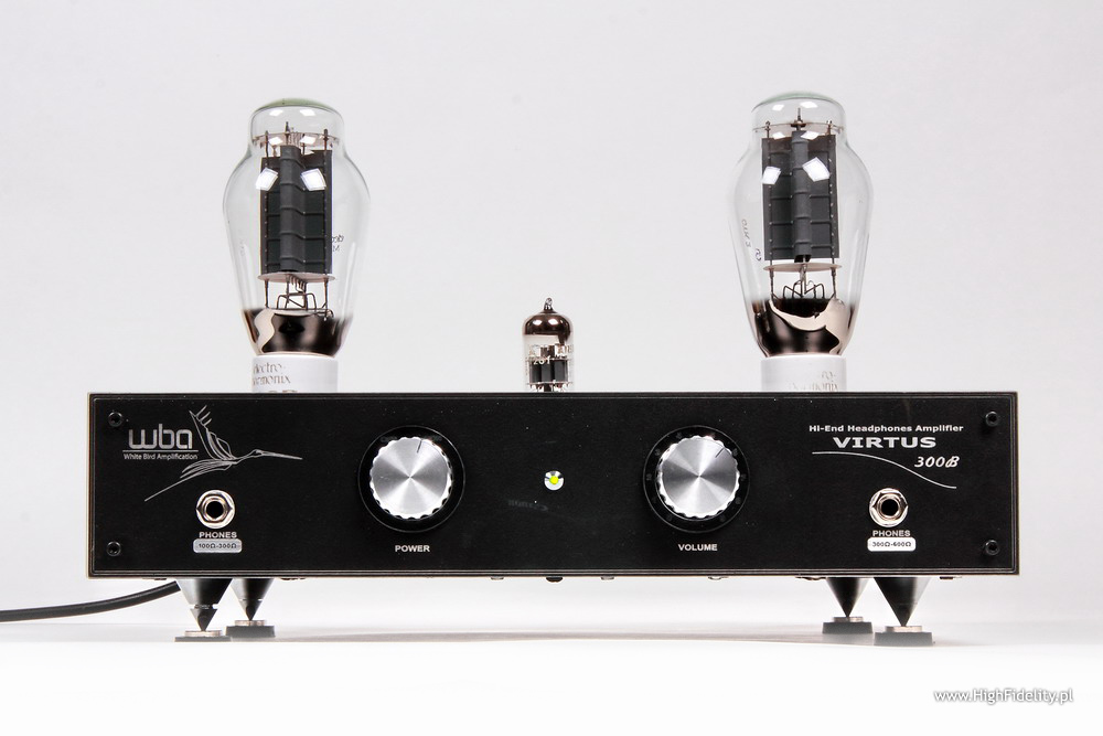 DESIGN The Virtus 300B from White Bird Amplifications is a tube headphone amplifier with a solid state power supply. The input stage employs the Electro-Harmonix 6H30PiEH gold pin dual triode; the output stage is based on the 300B Gold power triode from the same manufacturer. Front and back panel The unit is quite large. Its enclosure is made of bent steel sheets and the front panel of an acrylic plate. The plate is imprinted from behind with knobs descriptions, the manufacturer’s logo and the name of the product. There are two knobs – a volume control and a power switch. Two headphone jacks are located on the far left and right sides – the left one for 100-300 Ω and the right one for 300-600 Ω impedance. In the center, between the knobs there is a small LED indicating power-on. The back only features an IEC mains socket and two pairs of RCA connectors – input and output (pass-through).On the upper panel we have sockets for the three tubes and two round plastic ventilation grilles. In my opinion they look a bit out of place - the whole housing is very solid, sensibly designed, and these are so… plasticky. Next to the 300B sockets we can see small LEDs to indicate a tube failure. Underneath, there is another vent, covered with a prettier, but not particularly impressive plastic mesh. The unit stands on four sharp cones with the accompanying spacers lined with thick rubber pads.