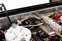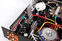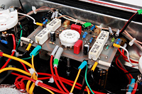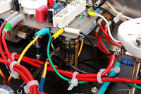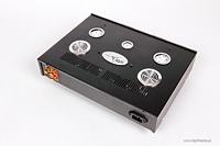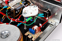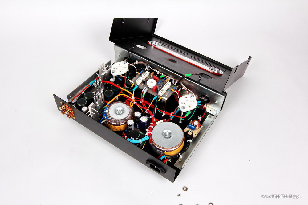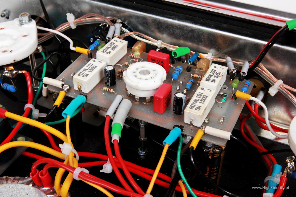 Interior All circuits are mounted on a few PCBs. Four of them comprise the power supply, one houses amplifier components. The power supply features two toroid transformers – separately for the anode voltage and the filament voltage. Tube heater filaments are powered by regulated DC supplies, separate for the left and right channel. The supplies feature numerous filter capacitors from different manufacturers. The anode voltage appears to be rectified and pre-filtered for all tubes. There is a bridge rectifier and several capacitors.The amplifier PCB is small; a ceramic socket for the input/driver tube is soldered to it. We can also see metal and ceramic resistors and Wima capacitors, as well as large Nichicon Muse capacitors, soldered from the bottom side. They serve as coupling capacitors between the output stage tube and the headphones (blocking the DC at output stage). Power tubes sockets are mounted to the bottom plate on long spacing bolts. Alps “Blue Velvet” potentiometer is used for volume control. The interior houses many cables and the whole looks like a well-made prototype.