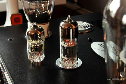 For this review the amplifier has been equipped with the Electro-Harmonix 300B EHG tubes. The tube driving the 300B, the 6H30Pi “super twin triode,” also comes from Electro-Harmonix. However, for comparison Mr. Bocianek put in the box another classic tube – the gold pin version of Tesla E88CC. We will also give it a listen.