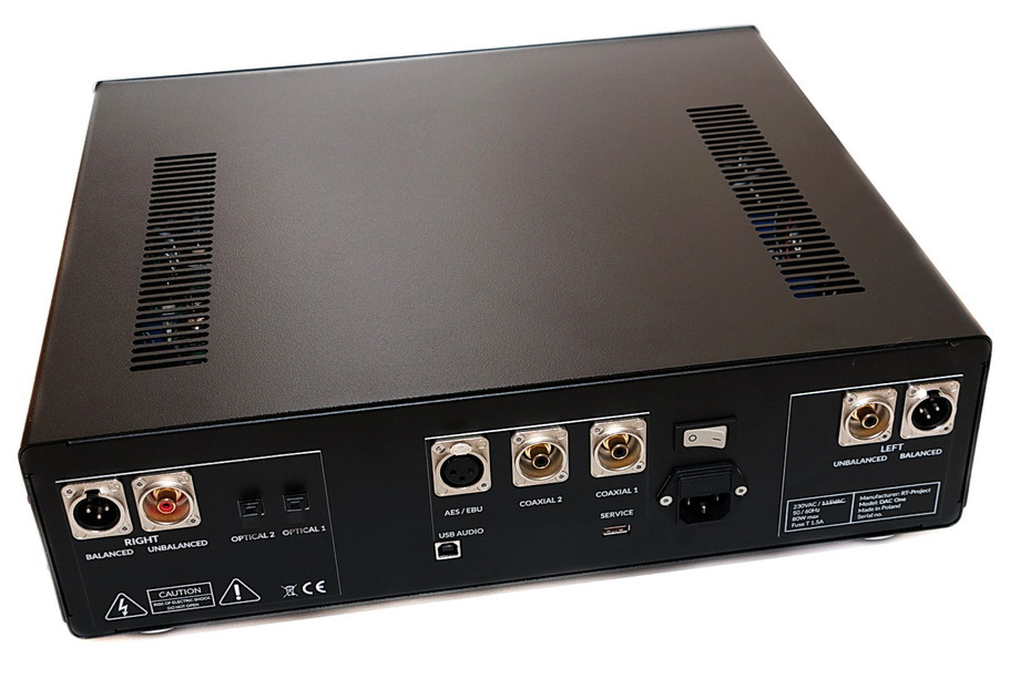 W ofercie firmy są w tej chwili dwa, a właściwie dwie wersje jednego produktu. To przetwornik cyfrowo-analogowy nazwany po prostu DAC One. Sekcja cyfrowa w obu wersjach jest taka sama – oparta o dwie kości DAC AKM AK4495, po jednej na kanał, każda w trybie „dual balanced”. Taka sama jest dość prosta, przynajmniej z zewnątrz, ale elegancka i porządnie wykonana stalowa obudowa z grubym, aluminiowym frontem. Różnica między wersjami sprowadza się do stopnia analogowego – w testowanej wersji zastosowano lampowy, w drugiej tranzystorowy. Producent zdecydował, że obie wersje nazywają się tak samo, pewnie dlatego, że podobieństw jest więcej niż różnic, choć jednocześnie twierdzi, iż oferują one znacząco różne brzmienie. Przyjmijmy więc, zgodnie z nomenklaturą wytwórcy, że mamy do czynienia z dwoma wersjami jednego produktu i jeszcze raz przypomnijmy, że testujemy lampową. Panowie z RT-Project przywieźli urządzenie w porządnym kejsie, który gwarantuje, że urządzenie dotrze w całości do klienta. To drobiazg, ale znam firmy, które uczyły się tego na własnych błędach i odpowiednie opakowanie powstawało dopiero, gdy kurierzy uszkodzili, czy wręcz zniszczyli kilka sztuk. To urządzenie o „standardowych” rozmiarach, czyli szerokie na 440 mm (400 mm głębokości i około 130 mm wysokości). Do testu trafiła wersja z frontem w kolorze srebrnym, ale jak producent pisze na swojej stronie internetowej, jest on dostępny w różnych kolorach i rodzajach wykończeń. Po lewej umieszczono okrągły wyłącznik zasilający, dalej wyświetlacz, osiem niewielkich przycisków, a po prawej pokrętło. Na wyświetlaczu, który można wygasić, do czego służy jeden z przycisków, odczytamy informacje o wybranym wejściu, parametrach otrzymywanego sygnału, aktualnej głośności oraz wybranym filtrze cyfrowym (do wyboru jest ich pięć, a wybieramy między nimi także przyciskiem). Sam wyświetlacz de facto zajmuje niewielką powierzchnię całego „okienka”, więc literki i cyferki są nieduże.  Przeznaczenie dwóch przycisków już wyjaśniłem, pozostałe sześć pozwala na wybór jednego z sześciu wejść cyfrowych. Do dyspozycji dostajemy bowiem dwa wejścia koaksjalne, dwa optyczne Toslink, AES/EBU oraz USB. Zestaw porządnych, posrebrzanych złączy Neutrika uzupełniają wyjścia analogowe – zbalansowane (XLR) i niezbalansowane (RCA). Nie mogło zabraknąć oczywiście gniazda zasilającego, obok którego umieszczono główny wyłącznik. Dodatkowym elementem jest port USB-A, który służy wyłącznie jako serwisowy, czyli np. do wgrywania nowego oprogramowania. Przetwornik akceptuje tylko sygnał PCM – przez wejście USB o rozdzielczości do 24 bitów i 384 kHz, pozostałe przyjmują sygnał do 24 bitów i 192 kHz. Z jednej strony szkoda, że nie można odtwarzać plików DSD, ale z drugiej wiele osób i tak korzysta wyłącznie z plików PCM. Z rozmów z konstruktorami wynika, że dla nich ważnym nośnikiem muzyki są płyty CD, a ich DAC ma być sposobem na poprawę jakości odtwarzanego dźwięku, nawet jeśli transport odczytujący płyty nie jest najwyższych lotów. W czasie testu korzystałem z dwóch źródeł sygnału – mojego dedykowanego komputera podpiętego do wejścia USB oraz transportu sieciowego/lokalnego/płyt Rokna Audio Wavedream NET podpiętego najnowszym kablem koaksjalnym Harmonixa. W czasie testu do dyspozycji miałem nie tylko wspomniany transport NET Rokny Audio, ale i DAC-a Wavedream tejże firmy. To znakomite, jedno z najlepszych, jakich słuchałem u siebie, urządzenie oparte o drabinkę rezystorową (czyli tzw. R2R zamiast kości DAC), które gra niezwykle czystym, rozdzielczym, doskonale poukładanym, ale i muzykalnym dźwiękiem. Siłą rzeczy musiałem więc odnosić DAC-a One nie tylko do swojego LampizatOra Golden Atlantic, ale i do Rokny.