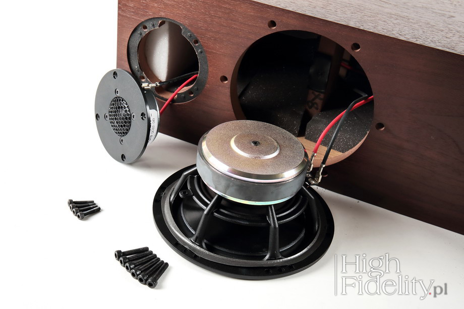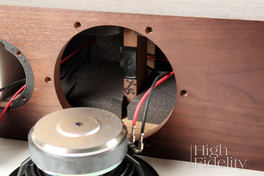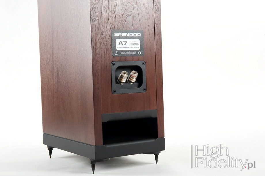 Wysiłki konstruktorów szły raczej, tak to czytam, w kierunku poprawy impulsu. Dlatego to szybki dźwięk, choć na pierwszy rzut oka taki się nie wydaje. Nie ma tu twardego ataku dźwięku, więc całość wydaje się wyważona i podana z rozmysłem. A jednak ilość informacji sugeruje, że nie ma w tym przypadku opóźnień, że dźwięk dochodzi do nas natychmiast. Porównania To niezwykle udane kolumny. W ogólnych ramach podobne do modelu Chartwell LS6/f różnią się od swojego brytyjskiego kuzyna nieco cieplejszym dźwiękiem, mocniej zwróconym w kierunku tradycyjnego modelu „BBC”. Grają też bliższym i bardziej namacalnym przekazem, nie pokazując tak dokładnie jak LS6/f informacji o tym, co dzieje się dalej, w głąb sceny. Są za to bardziej rozdzielcze przy pierwszym planie. Z kolei powstałe z mojej inspiracji kolumny Pylon Audio Emerald High Fidelity Edition grają „szerzej”, to znaczy mocniejszym dołem i górą, pokazują też większą dynamikę, którą nazwałbym „zewnętrzną”, to znaczy ukazującą zmiany dynamiki całego przekazu, podczas gdy Spendory świetnie ukazują dynamikę „wewnętrzną”, czyli zachodzącą pomiędzy poszczególnymi elementami. Podsumowanie Wszystkie trzy kolumny są świetne, są udane i można się w nich zakochać. Każdy z tych modeli jest jednak inny i spodoba się nieco innej grupie ludzi. Spendory to „czarusie”, grające na naszych emocjach z lekkością i bez wysiłku, kierując nas tam, gdzie chcą. Gęstość przekazu, jego nasycenie są wybitne, a wielkość przekazu zastanawiająca, przynajmniej jeśli podczas odsłuchów nie mamy zamkniętych oczu. Po ich otwarciu nie bardzo pasuje nam to, co widzimy, czyli niewielkie, dwugłośnikowe konstrukcje, i to, co słyszymy, to jest pełnię i dużą skalę. Tak powinno się robić dźwięk! ![]() Model A7 jest przeprojektowanym modelem A6R. Zmienił się głośnik wysokotonowy, przebudowano zwrotnicę przesuwając punkt podziału z 3,3 kHz na 3,7 kHz i zmieniono proporcje obudowy – z 934 180 x 305 mm na 875 x 192 x 280 mm. To jednak wciąż kolumna podłogowa o budowie dwudrożnej. Przetwarzanie basu wspomagane jest portem linear-flow, odmianą bas-refleksu; wylot został umieszczony z tyłu, tuż nad podłogą. W materiałach firmowych znajdziemy informację o tym, że system ten został tak zaprojektowany, aby kolumny można było ustawić nawet bardzo blisko tylnej ściany. | Przetworniki W modelu A6R, czyli poprzedniku A7, wysokie tony przetwarzała kopułka o średnicy ø 28-mm, szyli spora. Nowa seria korzysta z mniejszego głośnika, o średnicy ø 22 mm, z grubą fałdą zawieszenia, który ma pomóc w zmniejszeniu zniekształceń i poprawie kierunkowości. Zakryty został metalową siateczką, która ma go chronić przed uszkodzeniem. Głośnik otrzymał klasyczny magnes ferrytowy. Przetwornik nisko-średniotonowy ma średnicę ø 180 mm i bardzo solidny, odlewany kosz. jego membranę wykonano z polimeru o firmowej nazwie EP77 i zwieszono na gumowej fałdzie resora. Pośrodku widać nieruchomy stożek fazowy, linearyzujący fazę w punkcie przecięcia pasma z głośnikiem wysokotonowym. Często stożek tego typu służy także do chłodzenia nabiegunnika magnesu, musi być jednak metalowy. Ten tutaj wykonany jest z polimeru, jest więc tylko stożkiem fazowym. | Zwrotnica Przetworniki dzielone są przy 3,7 kHz w dość skomplikowanej zwrotnicy. Zmontowano ją na płytce drukowanej ze złoconymi punktami lutowniczymi i przykręcono do tylnej ścianki na wysokości głośników. Widać tam kondensatory polipropylenowe i dużą cewkę z rdzeniem proszkowym w sekcji niskotonowej. Jak się wydaje elementów jest sporo, ponieważ projektanci zdecydowali się na linearyzację impedancji. Kolumny mają być więc łatwe do napędzenia – ich impedancja nominalna wynosi 8 Ω, a minimalna 6 Ω. Głośniki łączone są za pomocą skuwek i kabli van den Hula CS122, plecionkami ze srebrzonej miedzi o wysokiej czystości. Zaciski głośnikowe są złocone, pojedyncze, w plastikowej wytłoczce. | Obudowa Obudowę wykonano z 18 mm płyt MDF i oklejono naturalnym fornirem z obydwu stron – od zewnątrz i od wewnątrz. Robi się to po to, aby lepiej kontrolować pracę obudowy. Dostępne są trzy rodzaj oklein – Black Ash, Dark Walnut i Natural Oak, a za dodatkowa opłatą także kolor biały. W przypadku Spendora uwaga skupiona na kontrolowaniu rezonansów obudowy jest tym ważniejsza, że to firma, która wpisuje pracę obudowy w cały system. Firma stosuje rozwiązanie, które nazwała Dynamic Damping. W klasycznych konstrukcjach walczy się o to, aby obudowa była możliwie najlepiej tłumiona. Tutaj w wybranych miejscach naklejono niewielkie, lekkie elementy z polimeru, które raczej kontrolują rezonanse niż je tłumią. Okazuje się jednak, że poza tym elementem to całkiem klasyczna konstrukcja – obudowa została od wewnątrz wzmocniona wieńcem, na którym opiera się od tyłu głośnik nisko-średniotonowy, a wnętrze wytłumiono dodatkowo płatami gąbki.