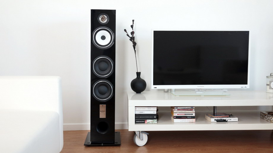 Zwrotnica | W zwrotnicach wszystkich kolumn z serii Esprit zastosowano komponenty wysokiej jakości, w tym miedziane cewki o średnicy 1 mm oraz kondensatory MET (Metallized Polyester Film). Terminale głośnikowe wykonano ze szczotkowanego aluminium, który to materiał nie tylko efektownie się prezentuje, ale jednocześnie ma właściwości antywibracyjne. Jak pisze producent, w celu zapewnienia najwyższej jakości połączenia, każdy terminal wyposażony jest w miedziane zaciski z samozamykającym systemem dedykowanym wtykom bananowym. Terminale głośnikowe przyjmują jednakże nie tylko banany, ale i widełki, bądź nawet gołe kable. Cokół | Obudowy ustawiono na oryginalnych, szklanych cokołach. Szkło połączono z perforowaną gumą, co zapewnia skuteczne tłumienie wibracji, a jednocześnie wymiary cokołów zapewniają kolumnom odpowiednią stabilność. W zestawie znajdują się dwa zestawy nóżek – aluminiowe stożki i gumowe nóżki na delikatne podłogi. Nawet te pierwsze są osadzone w gumowych kołnierzach i wpycha się je w stosowne otwory w szklanych płytach. Rozwiązanie to z jednej strony eleganckie, z drugiej samo w sobie stanowi element absorpcji niechcianych wibracji. ![]() Dane techniczne (wg producenta) Konstrukcja: trójdrożna, bas-refleks |