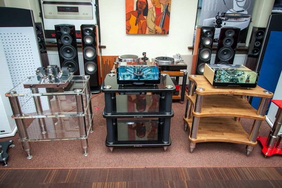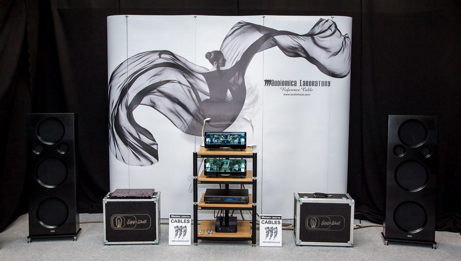 Prezentacje podczas Electronics Show na PTAK Warsaw Expo 2018 z kolumnami Ciarry i okablowaniem Audiomica + stoliki VAP. |