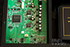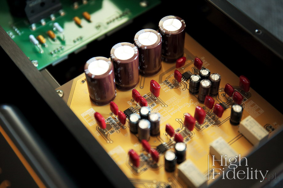 Zdekodowany i zamieniony na formę napięciową sygnał trafia za ekran po lewej stronie. Jest tam kompletny zasilacz oraz płytka wyjściowa. Wyróżnia się ona innym kolorem, ponieważ to specjalny jej rodzaj, droższy i lepszy. Widać na niej układy scalone wzmacniające sygnał wyjściowy, znajdziemy w nim także kondensatory polipropylenowe. Układ wygląda na prosty, a to zawsze dobry znak. Wyjścia włączane są przez przekaźniki.