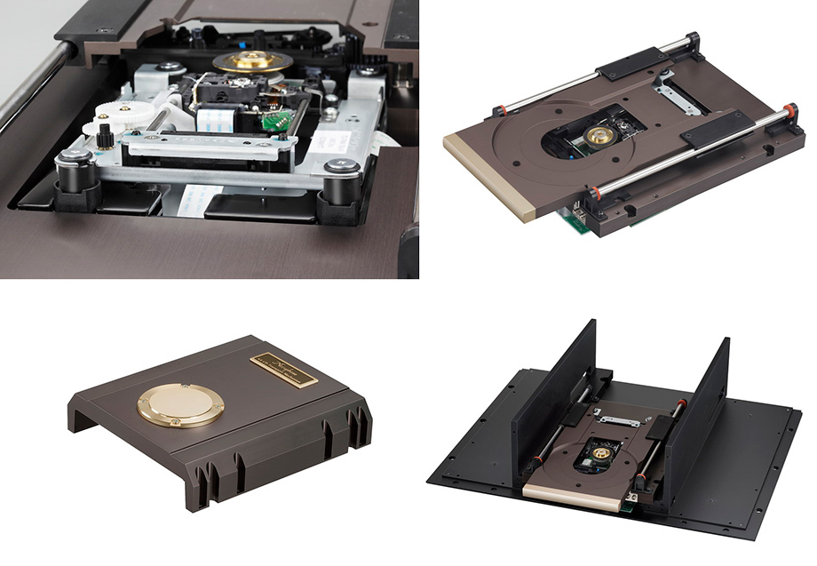 Transport użyty w DP-750 – szczegóły. Fot.: Accuphase Nowy transport jest większy, cięższy i ma sztywniejszą konstrukcję. Zastosowaliśmy też inny silnik, w którym zewnętrzny rotor bezszczotkowego silnika DC zamontowany został bezpośrednio na osi napędzającej płytę. Zmniejszyliśmy w ten sposób szumy mechaniczne oraz szumy pochodzące od obracanej płyty. System laserowy odsprzęgnięty został przez absorbery wykonane ze specjalnie do tej roli dobranego silikonu. Ta, wydawałoby się, niewielka zmiana pozwoliła zmniejszyć szum aż o 4 dB. I wreszcie ostatnia rzecz – cała ta konstrukcja przykręcona została bezpośrednio do grubej, aluminiowej płyty, co w porównaniu z DP-730 zredukowało szum transportu aż o połowę.