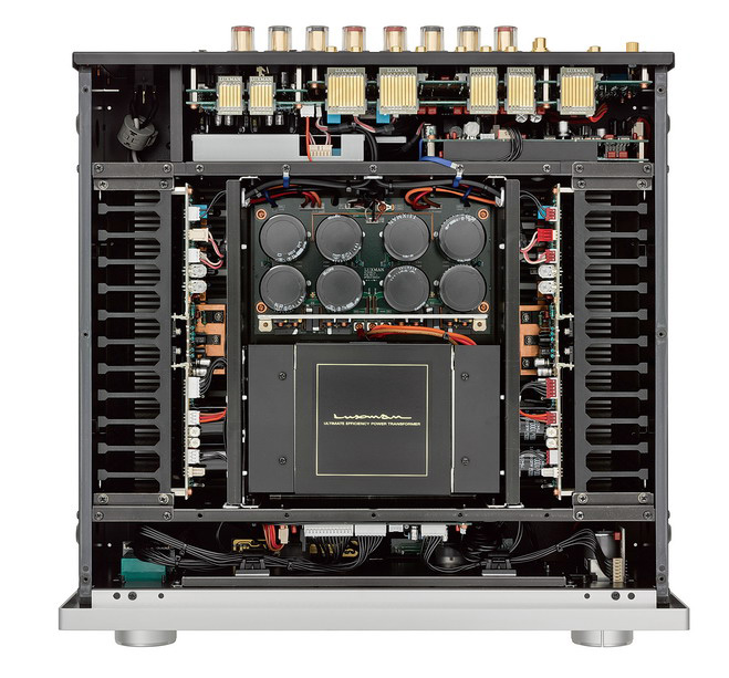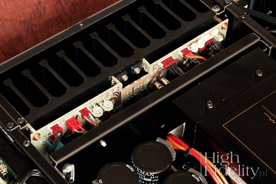 Ale to wszystko powoli, bez spięcia. Bo taki właśnie Luxman jest – to długodystansowiec, a nie sprinter. Wszystkie płyty zostaną przez niego potraktowane z podobną uwagą, żadna nie zostanie pokazana jako gorsza. Także mocne granie, jak z nowej płyty Alice in Chains, zabrzmiało mocno, gęsto, nisko. Nie było w niej tej samej dynamiki, jak ze wspomnianą już płytą A Ushera, ale dlatego, że tak po prostu została nagrana, a nie dlatego, że wzmacniacz ją spłycił. To wciąż było rasowe, niskie granie. Wraca się do tego wzmacniacza z przyjemnością. Nie ma się wrażenia przymusu, to nie jest „ćwiczenie”. Podobnie jest zresztą z jego obsługą. Już kiedyś o tym pisałem – Luxman zachowuje się trochę jak żywe stworzenie, klikając, mrugając, drgając, łagodnie poddając się naciskowi. Można na nim polegać. Nie musimy się bać, że z czymś wyskoczy, czy to ostrą górą, czy konturowym basem. Każda, dowolna płyta pokazywana jest z czymś w rodzaju – nie znajduję innego określenia – „czułości”. Rozdzielczość i selektywność nie są więc na pierwszym planie. To łączne granie, bez wyraźnego separowania planów i instrumentów. Przed słuchaczem rozwijana jest spójna, gęsta perspektywa. Jeśli szukacie państwo dokładnego rysowania detali, to raczej nie jest ten kierunek. Jeśli chcecie, aby wokale były blisko was, namacalne, musicie sięgnąć po inny wzmacniacz. Luxman jest po prostu inny, dzięki czemu nie jest podobny do dziesiątek innych wzmacniaczy zintegrowanych. Ma swój własny pogląd na wzmacniany sygnał. Podsumowanie To wzmacniacz, który daje komfort odsłuchu i spokój ducha. Ma nisko postawiony punkt ciężkości, jest pastelowy i nie narzuca się swoją obecnością. Potrafi zejść nisko na basie, pokazać szeroką panoramę, łącząc wszystko w funkcjonalną całość. Nie jest to urządzenie, które przykuwa jakąś konkretną cechą brzmienia, wypolerowaną i wychuchaną, stara się łączyć, a nie dzielić. Jego budowa jest znakomita, wyjście słuchawkowe i wejście gramofonowe bardzo fajne, a wygląd jedyny w swoim rodzaju. To rzadki przypadek grania zarówno „lampowego”, jak i „tranzystorowego” w dobrych proporcjach, bez walki o to, które podejście jest ważniejsze. ![]() L-509X jest sporym, ciężkim urządzeniem, którego obudowę wykonano z aluminiowych i stalowych elementów. Stalowe jest chassis, natomiast front, góra i boki to elementy z aluminium. W takiej kanapkowej budowie chodziło o zminimalizowanie drgań. Dodatkowo w kilku miejscach obudowy naklejono materiał antywibracyjny. Ale nie zapomniano także o takim połączeniu tych elementów, aby zminimalizować pętlę masy. Przód i tył | Przód to studium japońskiego funkcjonalizmu. Zostało ono podzielone na dwie strefy – z manipulatorami oraz ze wskaźnikami. Manipulatory mają postać gałek lub przycisków. Dwie duże gałki służą do zmiany wejść i siły głosu. Wybrane wejście sygnalizowane jest mikrodiodą LED o pomarańczowym kolorze, przy drugiej gałce nie ma podświetlanego wskaźnika. Balans, barwa, włączanie wyjść, zmiana czułości wkładki – to z kolei domena małych gałek. Takie funkcje, jak skracanie ścieżki sygnału, rozłączanie końcówki i przedwzmacniacza – to domena przycisków. Nie ma chyba wątpliwości co do tego, że najważniejszym elementem projektu plastycznego wzmacniaczy Luxmana są wychyłowe wskaźniki VU-metr (czyli: woltomierze). W tym modelu są one podświetlane mleczną barwą i są naprawdę duże. Pod nimi umieszczono rząd pomarańczowych diod LED, które informują o wybranej funkcji. Tył został podzielony funkcjonalnie – powyżej są wejścia i wyjścia liniowe, a poniżej wyjścia głośnikowe. Do dyspozycji mamy cztery wejścia liniowe na gniazdach RCA, dwa wejścia liniowe na gniazdach XLR oraz jedną pętlę do nagrywania – w sumie daje to siedem wejść liniowych. A jest jeszcze wejście gramofonowe dla wkładek MM i MC; wybieramy między nimi gałką na przednim panelu. Gniazda wejścia Line 1 są znacznie lepsze od pozostałych i to powinno być dla nas wejście główne. Wejścia XLR przeznaczone są dla źródeł z sygnałem zbalansowanym, ale tylko jeśli kable są długie – sygnał jest za nimi desymetryzowany. To gniazda połączone według starego standardu „amerykańskiego”, obecnego również w Japonii, to znaczy z „gorącym” pinem nr 3. Żeby zapewnić właściwą fazę absolutną można to zmienić małym przełącznikiem zaraz obok. Na tylnej ściance mamy też wejście na końcówkę mocy i wyjście z przedwzmacniacza. Gniazda głośnikowe są podwójne (A i B). I jest jeszcze gniazdo zasilające IEC – ma ono tylko dwa bolce, bez bolca ochronnego. Środek | Urządzenie zostało skonstruowane w sposób charakterystyczny dla japońskich firm z wyższej półki, ale wciąż z „głównego nurtu”. Wnętrze jest podzielone na sześć komór stalowymi ekranami, które są też elementami usztywniającymi obudowę. Pośrodku mamy największą część, z zasilaczem. Jego podstawą jest duży, ekranowany transformatory typu EI, z którego wychodzimy aż czterema uzwojeniami wtórnymi, dla: końcówek mocy, drivera końcówki mocy, przedwzmacniacza oraz regulacji barwy i dla układu zabezpieczającego. Układ mikrokontrolera otrzymał osobny transformator, zasilany jest więc z osobnej linii. Dodajmy, że każda z końcówek mocy oraz drivery mają osobne zasilacze, przy czym ten dla drivera jest stabilizowany.