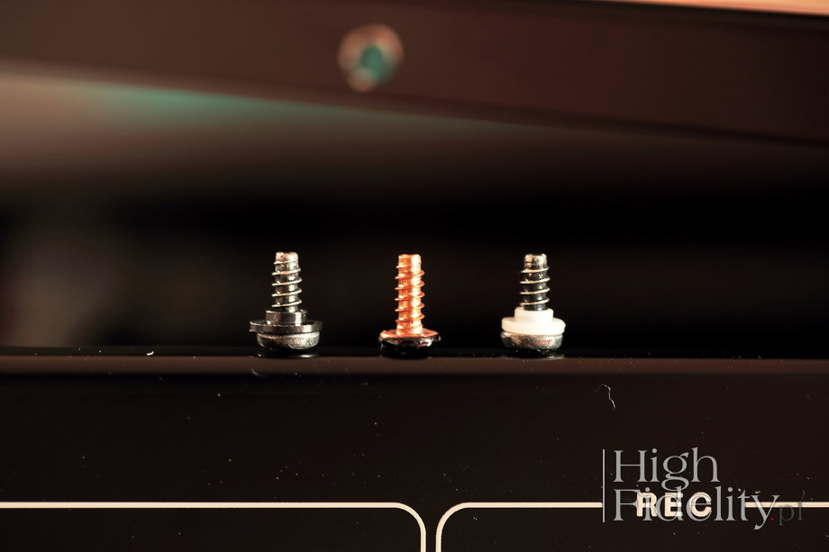 Trzy rodzaje wkrętów, jakimi mocowane są elementy obudowy wzmacniacza W testowanym wzmacniaczu mamy bowiem chyba wszystko, co może się przydać w rozbudowanym systemie audio. Jest regulacja barwy dźwięku i balansu między kanałami, układ loudness, przełącznik aktywujący wyjścia głośnikowe lub je wyłączający, dwie pary tych wyjść, wzmacniacz słuchawkowy i przedwzmacniacz gramofonowy MM/MC, selektor odłączający przedwzmacniacz i końcówkę mocy, jak również wejścia zbalansowane XLR i niezbalansowane RCA. Jest też pilot zdalnego sterowania z aluminium, na którym znajdziemy większość tych funkcji, wraz z przyciskiem „Line Straight”, za pomocą którego omijamy cały blok regulacji barwy. JAK SŁUCHALIŚMY Wzmacniacz stanął na górnej półce stolika Finite Elemente. Zasilany był kablem Harmonix X-DC350M2R Improved-Version, a sygnał z odtwarzacza Ayon Audio CD-35 HF Edition wysyłany był do wejścia Line 1 (RCA) kablem Acoustic Revive RCA-1.0 Absolute. Wzmacniacz oferuje także wejścia zbalansowane XLR, ale ma budowę niesymetryczną, sygnał jest za nimi desymetryzowany. Ich użycie ma sens tylko wtedy, kiedy interkonekt jest naprawdę długi, ma powyżej 2 m. W czasie testu sekcja regulacji barwy była odłączona („Line Straight”). ![]() Płyty użyte do odsłuchu (wybór):