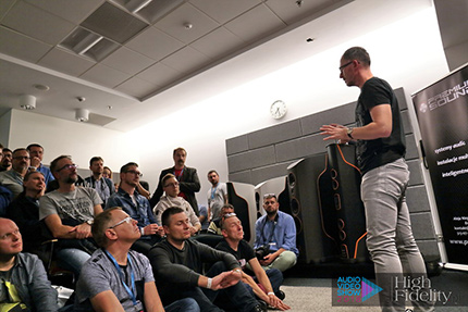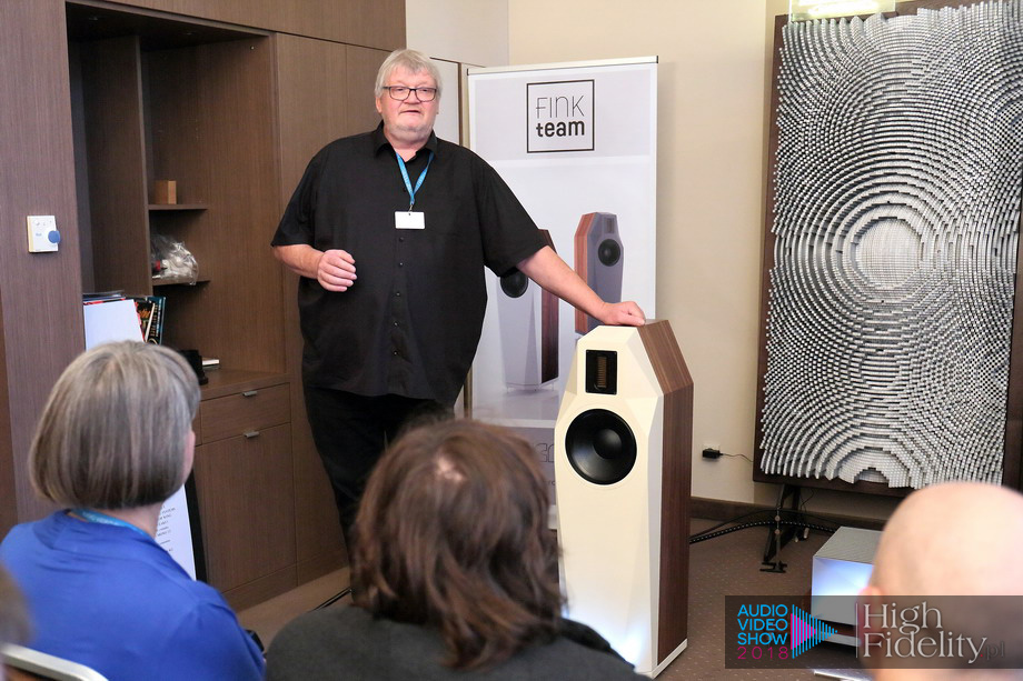 Od lewego, górnego rogu: Paul Miller, Ken Kessler, Alan Sircom, Andrew Harrison Wszyscy przyszli dla jednego człowieka – dla konstruktora, Karla Heinza Finka. To on stał za wieloma rynkowymi hitami, takimi jak choćby Tannoy Mercury M1/M2, a także, nagrodzonymi ostatnio nagrodą EISA, kolumnami Q-Acoustics 500. Jego firma wynajmowana była przez duże firmy do konkretnych projektów. Dopiero niedawno założył swoją własną firmę produkcyjną o nazwie FinkTeam. Prezentacja opierała się głownie na rozważaniach poszczególnych aspektów technicznych nowych konstrukcji i było to, muszę powiedzieć, ciekawe, pouczające, zabawne. A dźwięk? Genialny!