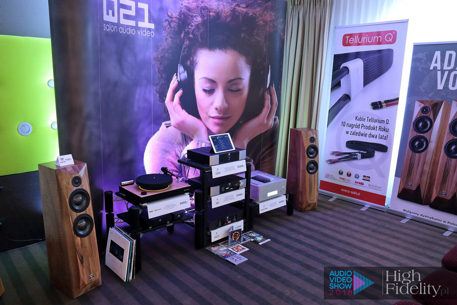 - Pokój przygotowany przez salon Q21, będący również dystrybutorem marki Audiolab. W systemie mieliśmy kolumny słowackiej firmy Adam Vox, model Ashkelon, oraz elektronikę Moon Audio – odtwarzacz CD 260D, odtwarzacz plików/przedwzmacniacz 390 i końcówkę mocy 330A. Najczęściej komentowano jednak gramofon Mag−Lev Audio z talerzem na poduszce magnetycznej, bez żadnego łożyska.
