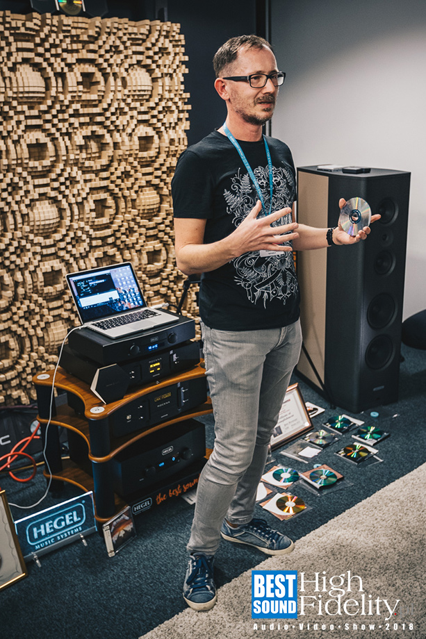 Porównywaliśmy, że przypomnę, te same nagrania z płyt CD – tłoczonej, Master CD-R, Master Gold CD-R oraz Hard Glass Master CD-R, którą starałem się państwa przyciągnąć :) Do dyspozycji mieliśmy dwa różne tytuły, a na koniec porównaliśmy płytę Hard Glass Master CD-R z plikiem Master DSD256, z którego został przygotowany dla niej sygnał PCM 44,1/16. Skorzystaliśmy przy tym z gościnności gospodarzy, to jest salonu Premium Sound i firmy Hegel. Muzyka puszczana była z odtwarzacza CD Mohican i wzmacniacza/DAC-a Hegel H590 tej firmy przez kolumny AudioSolutions. Jestem pod wielkim wrażeniem państwa wrażliwości, osłuchania i otwarcia na NOWE. Żartowałem wprawdzie, że chciałbym, aby się państwo zgadzali z moimi tezami, wierzę jednak w to, że odebraliście to właśnie jako żart. Różnice między płytami były bowiem klarowne, a momentami niebywałe, większe niż po zmianie któregoś z komponentów. Zgodnie z tym, co sam słyszałem, za każdym razem wybierali państwo wersję droższą, która okazywała się lepsza, z absolutną kulminacją przy szklanej płycie CD-R.