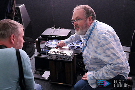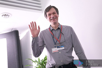 Dirk Sommer w rozmowie z jednym z uczestników spotkania Pisaliśmy o tym wielokrotnie, więc tylko przypomnę w paru słowach, że Dirk to człowiek analogu. Nagrywa na taśmie analogowej, remasteruje w domenie analogowej i w domu najchętniej słucha taśm i płyt LP. Ale jest też świetny w cyfrze, co udowodnił i tym razem. Dzień wcześniej spotkaliśmy się na chwilę (a na dłużej w tym samym dniu), żeby napić się wina. Dirk opowiedział wówczas o swoim nowym projekcie, to jest cyfryzacji swojego zbioru taśm. Do tego celu wybrał sygnał DSD i to od razu w najwyższej jakości, czyli w DSD256. Uważa, że to format najbliższy „prawdy” analogu.