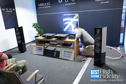 Bardzo, po prostu bardzo przyjemnie grał system oparty o, nagrodzone przez nas tytułem Best Product 2018, kolumny Harbeth M30.2 40th Anniversary Edition. To nie była droga elektronika – Creek z serii Evolution 100, ale to źródło – gramofon Bergmann Audio Magne T.T System – oraz zasilanie – kondycjoner PS Audio DirectStream P15 Power Plant – robiły całą „robotę”. To był wyważony, zrelaksowany przekaz do długich odsłuchów. Prezentacja | Wystawa dla dziennikarza to czas miotania się między pokojami, próby rozmów – zwykle urywanych po kilku minutach – a także nieliczne prezentacje, w których uczestniczy on jako słuchacz. Te ostatnie są nieliczne, ponieważ trwają od 30 minut do godziny, a przez to zabierają zbyt wiele czasu, którego nie mamy. Nie mogłem jednak opuścić spotkania prowadzonego przez mojego przyjaciela Dirka Sommera, na co dzień redaktora naczelnego magazynu hifistatement.net, z którym „High Fidelity” łączy umowa o współpracy, a co jakiś czas wydawcy płyt z logiem Sommelier Du Son.
