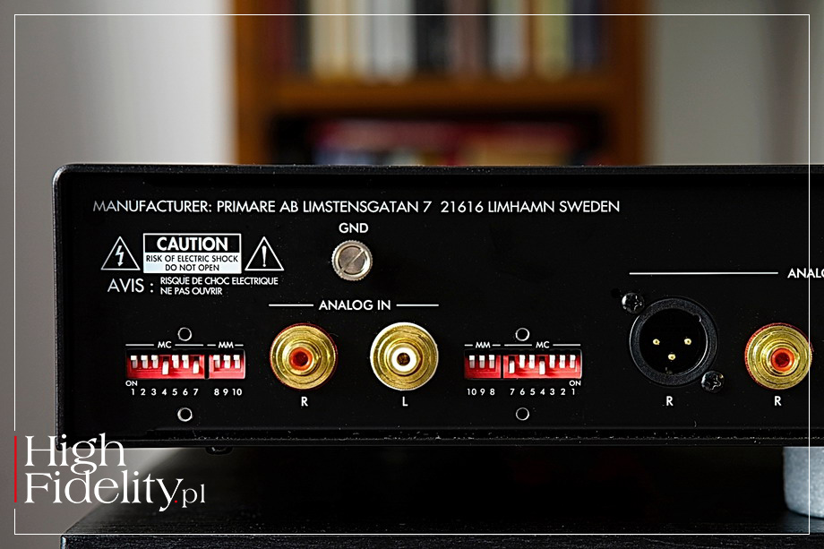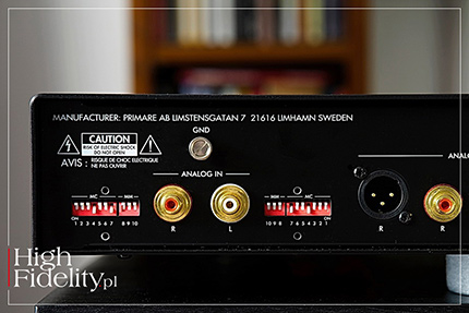 Muzyka dość jednoznacznie kojarzyła mi się właśnie z Portugalią, z fado, a realizacja, w sensie jakości dźwięku i tłoczenia jest znakomita. Moje ukochane gitary zachwycały brzmieniem, organicznym, dźwięcznym, z pełnymi wybrzmieniami, z dobrymi proporcjami pudła i strun. Brzmiały co prawda dość miękko, nie tak ostro, czy nawet agresywnie jak to często ma miejsce w przypadku choćby nagrań flamenco, ale wydaje mi się, że takie było zamierzenie muzyków i realizatorów nagrania. W jednym z utworów pojawia się dodatkowo perkusja, a R35 pochwalił się przy tej okazji tym, w jaki mocny sposób potrafi odtworzyć dobre nagranie tego instrumentu. Całość brzmiała niezwykle organicznie i klimatycznie. Nowy przedwzmacniacz gramofonowy Primare bardzo dobrze sprawdził się i z muzyką akustyczną, i z elektroniczną, pozostało mi więc jeszcze postawić go przed dwoma poważnymi wyzwaniami – mocniejszym (niż R.E.M.) rockiem i dużą klasyką. Już przy pierwszym prawdziwie rockowym krążku, 4. albumie Led Zeppelin potwierdziło się kolejny raz, że średnica jest mocną stroną R35. Świetnie brzmiał bowiem wokal Planta, a gitara Page'a miała odpowiednie mięcho i energię. Dół pasma był co prawda dość energetyczny, ale ciut zaokrąglony, nie tak zwarty i precyzyjny, jak do tego przywykłem z moim przedwzmacniaczem. Zaraz potem na talerz gramofonu trafił album Brothers in arms Dire Straits wydany przez MobileFidelity na dwóch płytach na 45 RPM. To, co prawda cyfrowa rejestracja, ale jednocześnie dobre i świetnie zremasterowane nagranie. Primare zagrał je czysto, z ładną, dźwięczną, otwartą i nieźle różnicowaną górą, z mocno zaznaczonym, punktualnym, barwnym, ale nie podbarwionym, nisko schodzącym basem, no i znakomitym wokalem i gitarą Marka Knopflera. Całość została zagrana w płynny, spójny sposób który sprawił, że z prawdziwą przyjemnością przesłuchałem całą, znaną niemal na pamięć płytę. Dla pewności zagrałem jeszcze m.in. Final cut Floydów, gdzie testowany przedwzmacniacz gramofonowy musiał wykazać się sporymi możliwościami w zakresie dynamiki, także tej w skali makro, umiejętnością zdrowego „przyłożenia” w odpowiednim momencie (a to kwestia nie tylko energetyczności i zejścia na dole pasma, ale i dobrego timingu), a nawet przekonującego oddania sporego wybuchu (znający tę płytę wiedzą, o którym momencie mówię). Można więc spokojnie przyjąć, że rock jest całkiem mocną stroną R35. No i na sam koniec zostawiłem nieco krążków z klasyką. Wśród nich znalazły się płyty, wszystkie wydane w Japonii, zakupione u, znanego coraz większemu gronu miłośników winyli i muzyki, Mieczysława Stocha. Choćby 1. i 2. Symfonia Beethovena pod Bruno Walterem, wydane przez CBS/Sony. Primare zagrał je w sposób dość bliski i ciepły, potwierdzając dobrą rozdzielczość i selektywność, mikro i makro dynamikę, choć orkiestrze ciut więcej rozmachu by się przydało. Szwedzki przedwzmacniacz umieścił orkiestrę między kolumnami rozbudowując jej obraz nieco bardziej w głąb, zaznaczając kolejne plany, pozwalając śledzić wybrane sekcje – słowem, robił właściwie wszystko, czego można wymagać od urządzenia z wysokiej półki. Nie zmienia to faktu, że i tu najważniejsze były naturalność i spójność brzmienia. Orkiestra była bardziej jednym, dużym organizmem niż grupą wielu grających obok siebie, czy nawet razem, instrumentów. W czasie odsłuchów nie mogło zabraknąć również kilku moich ulubionych oper. Carmen z Leontyną Price potwierdziła, że R35 dobrze radzi sobie z oddawaniem głębi sceny, potrafiąc jednocześnie skupić uwagę słuchacza na pierwszym planie, na solistach. Tych rysował w wyrazisty, namacalny sposób, przekonująco oddając emocje i nastroje zmieniające się czasie przedstawienia, będące przecież jego kluczowym elementem. Trudno więc było mi się do czegokolwiek przyczepić, a tak naprawdę nawet o tym nie myślałem, z niecierpliwością sięgając po kolejne ulubione krążki. Z równie wielką przyjemnością posłuchałem np. Wesela Figara pod Currentzisem. Mimo że Primare mocniej dociąża i wypełnia dźwięk niż mój Nibiru, to w brzmieniu orkiestry nie brakowało rozmachu i polotu, była nawet mozartowska lekkość i swoboda, więc i tym razem przesłuchałem całość z uśmiechem na twarzy. | PODSUMOWANIE Świetnie wykonany i wyglądający (OK, to kwestia gustu – mnie się podoba) przedwzmacniacz gramofonowy z szeroką gamą ustawień, w tym gainem umożliwiającym współpracę, na dobrą sprawę z niemal (piszę „niemal” jedynie na wszelki wypadek) każdą wkładką dostępną na rynku. A gdy już zaczyna grać, oferuje nasycone, dociążone, rozdzielcze, poukładane granie, które łatwo wciąga w świat muzyki. I to właściwie dowolnej, bo dał radę każdej, której z nim słuchałem. Dodatkowym atutem są wyjścia zbalansowane, które na tym poziomie cenowym są prawdziwą rzadkością. Myślę, że R35 powinien znaleźć się na liście urządzeń do obowiązkowego odsłuchu każdego, kto poszukuje nowego przedwzmacniacza i ma do wydania nawet 10 000 złotych. ![]() R-35 to przedwzmacniacz gramofonowy przeznaczony do współpracy zarówno z wkładkami typu MM, jak i MC. Umieszczono go w pełnowymiarowej obudowie z solidnym, aluminiowym frontem. Przyglądając się jej można odnieść wrażenie, że wnętrze wraz z frontem i tylną ścianką są nieco wysunięte w stosunku do pokrywy z bocznymi ściankami. Za frontem bowiem widać szczelinę, tył natomiast jest z kolei nieco schowany pod wysuniętą pokrywą. Daje to ciekawy efekt wizualny, choć by go dostrzec trzeba spojrzeć na urządzenie z boku. Przód i tył | Na przedniej ściance centralnie, wkomponowane w logo firmy, umieszczono włącznik urządzenia i diodę zasilania. Główny włącznik znalazł się na tylnej ściance, a ten z p