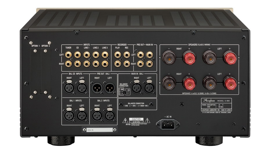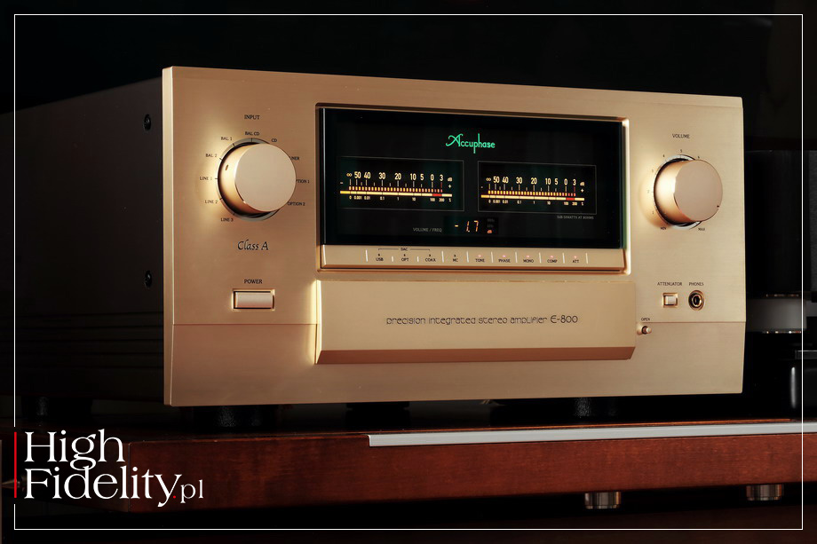 | PRECISION INTEGRATED STEREO AMPLIFIER E-800 Jego dane katalogowe wyglądają w następujący sposób: waga – 36 kg, wymiary – 465 x 239 x 509 mm (szer. x wys. x gł.), a moc – 50/100/200 W dla, odpowiednio, 8/4/2 Ω. I chociaż 50 W przy 8 Ω może nie robi aż tak wielkiego wrażenia, to jeśli weźmiemy pod uwagę, że to konstrukcja pracująca w klasie A i że zmniejszając impedancję obciążenia o połowę zwiększamy moc o drugie tyle, a wzmacniacz obsługuje nawet 1 Ω (przy którym dostaniemy aż 300 W!), to już daje do myślenia. Powiem zresztą coś jeszcze – wzmacniacze tej firmy pracujące w klasie A oddają znacznie wyższą moc niż katalogowa, ponieważ po deklarowanej mocy w klasie A przechodzą do pracy w klasie AB. Tak naprawdę wraz z E-800 dostajemy więc sporą elektrownię. Wygląd | Mający uświetniać 50-lecie marki E-800 otrzymał wszystko, co w jej ofercie najlepszego. Ale też jest to wzmacniacz będący jej klasycznym produktem. Przednia ścianka z aluminium została poanodowana na kolor złoty. Pośrodku mamy duże, szklane okienko, pod którym ukryto diodowe wskaźniki mocy wyjściowej, alfanumeryczny wskaźnik siły głosu, który może również pokazywać częstotliwość próbkowania sygnału cyfrowego (po zainstalowaniu odpowiedniej karty). Co charakterystyczne, duża część diod świecących LED ma kolor pomarańczowy. Poniżej znajdziemy kolejne diody świecące LED, a jeszcze niżej uchylaną ręcznie klapkę. Ukryto pod nią mnóstwo manipulatorów, które we współczesnych wzmacniaczach zazwyczaj nie występują. Ale to kolejne dziedzictwo lat 70., z którego firma jest dumna. Po bokach mamy dwie, duże gałki – siły głosu i zmiany wejść, a pod tą pierwszą także gniazdo słuchawkowe. Całość robi ogromne – dosłownie – wrażenie, a wzmacniacz jest wykonany po prostu perfekcyjnie. Wyposażenie | Jak wspomniałem, jeśli chodzi o funkcjonalność, dla Accuphase’a modelem są lata 70., kiedy to każdy wzmacniacz miał regulację barwy, mnóstwo wejść i wyjść, pozwalał też na niezależną pracę przedwzmacniacza i końcówki mocy, oferował pętlę do nagrywania itd. „Odchudzanie” wyposażenia urządzeń takich, jak E-800 rozpoczęło się wraz z falą nowych, brytyjskich wzmacniaczy w latach 80., a potem 90. ustaliła się nowa funkcjonalność – wystarczyła gałka siły głosu i kilka wejść liniowych. Japoński producent Fundamental w swoim przedwzmacniaczu liniowym LA10 version II dotarł chyba najdalej, ponieważ dostępne jest w nim tylko jedno wejście. | ODCHUDZANIE