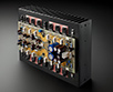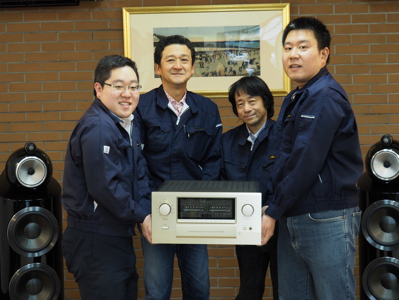 Zespół odpowiedzialny za E-800 (od lewej): pan Mukaida-san, pan Akizawa-san, pan Okamoto-san i pan Hotta-san. Za stronę mechaniczną urządzenia, a więc obudowę, mocowania itd. odpowiedzialny jest pan OKAMOTO. Ma 54 lata i pracuje w firmie Accuphase 31 lat. Pasjonuje się analogowymi aparatami fotograficznymi, które kolekcjonuje, a w tej chwili ma – jak pisze Mark – „fioła” na punkcie Nikona F3 i F4. Sekcją przedwzmacniacza zajął się pan HOTTA. Ma 37 lat i pracuje w firmie od dziewięciu lat. Poprzednio zaprojektował przedwzmacniacz C-2850, wzmacniacz zintegrowany E-480 i inne. Kocha muzykę klasyczną i gra na skrzypcach. Pan MUKAIDA zaprojektował do E-800 końcówki mocy. To najmłodszy inżynier w tej grupie i jeden z najmłodszych pracowników Accuphase’a – ma 32 lata, a mimo to otrzymał niezwykle odpowiedzialne zadanie. Jego pasją jest jazda na rowerze (w weekendy), a co jakiś czas bierze udział w wyścigach na rowerach typu Endurance. I wreszcie układy towarzyszące, to znaczy sterowanie mikroprocesorowe, jego oprogramowanie, zasilanie itp., to dzieło pana AKIZAWA. Ma on 54 lata i jest związany z firmą od 31 lat. W weekendy gra ze swoim 10-letnim synem w baseball. ♦ Obudowa | Obudowa E-800, choć duża, jest niesamowicie sztywna i dobrze tłumiona – popukiwanie w ścianki boczne kończy się głuchym, krótkim dźwiękiem. Jak już pisałem, wykonana jest ona na wzór kratownicy statku, z podwójnymi ściankami bocznymi i grubym frontem z aluminium. W komorze z tyłu mamy płytki z gniazdami wejściowymi i wyjściowymi, wraz z układami scalonymi buforującymi wyjścia liniowe. Gniazda XLR pochodzą od Neutrika i są złocone, z kolei RCA budowane są dla Accuphase’a i złoconą mają tylko masę. Gniazda XLR okablowane są w stary sposób, „amerykański” (pin 2 = „cold”). Obok jest przełącznik, którym możemy zmienić fazę absolutną do standardu DIN (pin 2 = „hot”). Przedwzmacniacz | Układ AAVA, czyli właściwy przedwzmacniacz, wraz z rozbudowanym zasilaczem stabilizowanym znalazł się z kolei w komorze przy przedniej ściance. Ta płytka drukowana wygląda najlepiej – ma złocone ścieżki i wyraźnie lepszy podkład. Jest też wykonywana inaczej niż pozostałe. Przypomnijmy, że w AAVA regulacja poziomu sygnału przeprowadzana jest w domenie prądowej, dokładnie tak samo jak w wysokiej klasy stołach mikserskich (analogowych) – to regulacja w domenie analogowej, nie ma w niej nic z cyfry. Obok jest płytka z regulacją barwy dźwięku. Cała ta sekcja ma wzmocnienie 18 dB. Końcówki mocy | Końcówki mocy przykręcono bezpośrednio do dużych radiatorów, po dwóch bokach wzmacniacza. Radiatory mają duży zapas, ponieważ wzmacniacz nie grzeje się aż tak, jak można by tego oczekiwać po urządzeniu tej mocy, pracującym w klasie A. O ile w przedwzmacniaczu królują układy scalone, o tyle końcówki zbudowane są wyłącznie z tranzystorów; na wyjściu pracuje sześć par komplementarnych tranzystorów ON 1H48AA+1H48AK – to tranzystory typu MOS-FET. Ta sekcja ma wzmocnienie 28 dB. Przy wyjściach głośnikowych jest dwustopniowy układ zabezpieczający wzmacniacz. Najczęściej pracują tu przekaźniki, ale Accuphase od modelu P-4200 (rok 2013) stosuje w nim tranzystory MOS-FET. Wybór ten podyktowany jest potrzebą zmniejszenia impedancji wyjściowej – również dlatego cewki w układzie Zobela na wyjściu mają gruby drut o przekroju prostokątnym. W E-800 tłumienie wyjścia wynosi 1000.