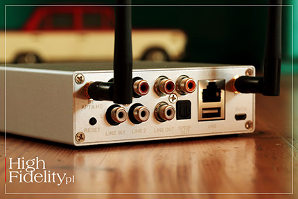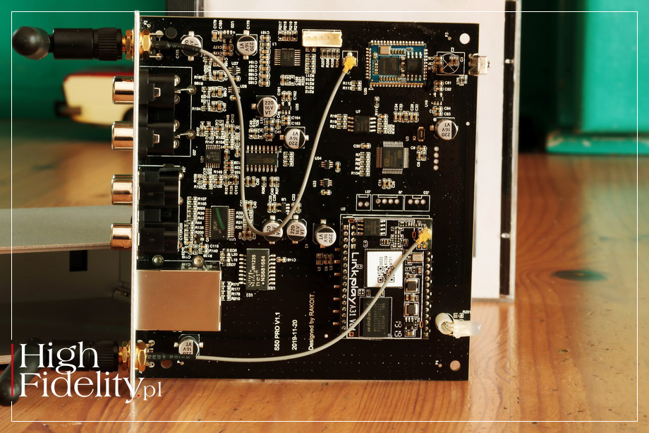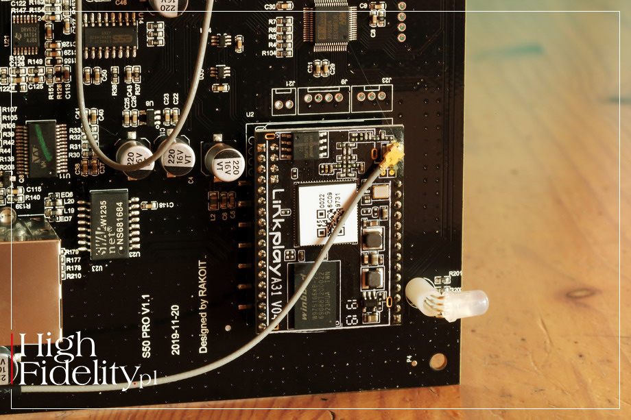 Bo z własnym zasilaczem odtwarzacz gra fantastycznie. Jego dźwięk jest niezwykle plastyczny i świetnie poukładany. Nie udaje czegoś, czym nie jest, to jest wypasionego streamera z high-endu, a skupia się na „tu i teraz”. Jego sterowanie za pomocą aplikacji jest łatwe, szybkie, intuicyjne i nigdy mi się nie zawiesiło. W aplikacji zabrakło mi tylko informacji o tym, jakiego rodzaju plik odtwarzamy i przewijania tytułu. Do samego odtwarzacza nie mam żadnych uwag, za te pieniądze jest bez wad. ![]() Urządzenie jest niewielkie i ładnie wykonane. W jego stylizacji, jak również w tym, jak jest pakowane, widać wpływ urządzeń firmy Apple. Ale to naturalne, to dobra stylistyka, a poza tym wszystkie te produkty powstają w Chinach, więc nie trzeba niczego „odgapiać”. Obudowę wykonano z aluminiowego profilu, z akrylowym frontem. Odtwarzacz stoi na czterech, płaskich podkładkach gumowych. Przód i tył | Z przodu mamy jedynie multikolorową diodę świecącą (LED), informującą o statusie urządzenia. Z tyłu są niezłocone wejścia i wyjścia liniowe, a także wyjścia cyfrowe. Po bokach wkręcamy dwie antenki, które zapewniają łączność Wi-Fi. S50 Pro można podłączyć z siecią domową albo przewodowo (Ethernet), albo bezprzewodowo. Zasilanie zapewnia zewnętrzny zasilacz impulsowy 5 V/1 A z wtykiem micro USB. Środek | Układ elektroniczny zmontowano techniką SMD na jednej płytce drukowanej, zajmującej całe wnętrze urządzenia; osobna płytka, wpinana przez wtyk miltipinowy, to odbiornik Wi-Fi Linkplay A31. Linkplay jest chińską firmą założoną w 2014 roku przez inżynierów pracujących wcześniej w firmach Google, Broadcom, InterVideo i Harman, wykonującą różnego typu moduły łączności dla wielu dużych graczy. Zmiana siły głosu odbywa się w domenie cyfrowej, w przetworniku D/A. Tak więc sygnał z wejść analogowych musi być najpierw zamieniony na cyfrowy – odpowiada za to układ A/D AKM 5720VT. To mający już parę lat układ 24/96 typu delta-sigma.