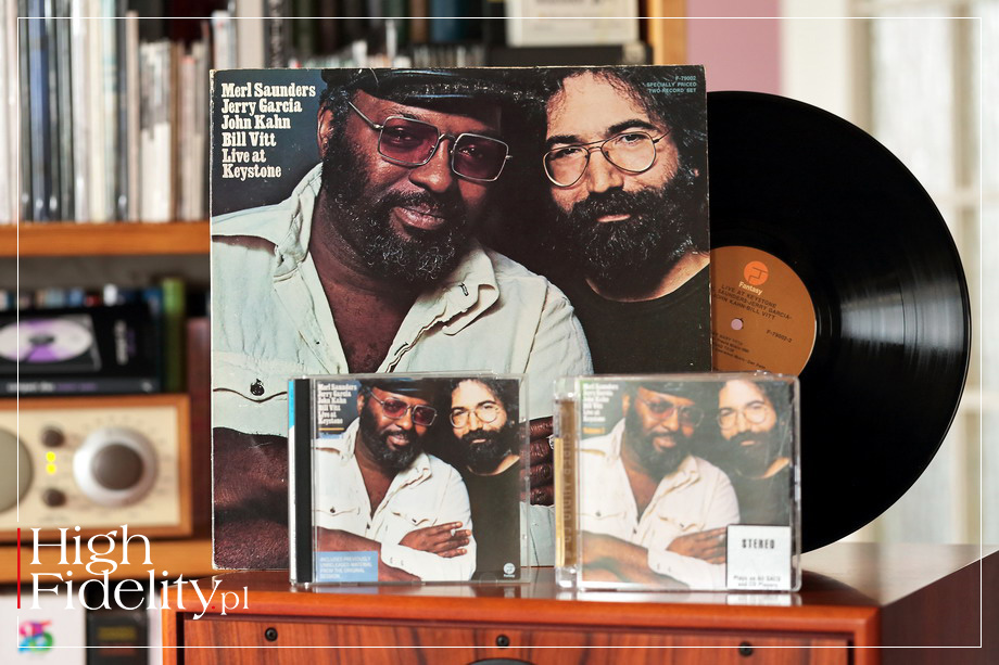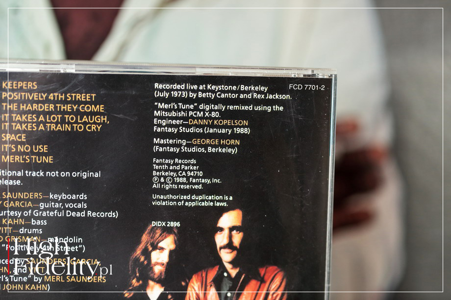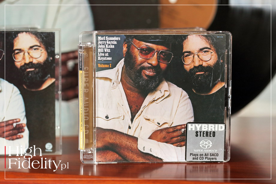 W wydaniu CD wypisano starannie sprzęt użyty do nagrania, a także ludzi odpowiedzialnych za to wydawnictwo. Dźwięk | Koncert „reaktywowanego” zespołu Modern Jazz Quartet został zarejestrowany tuż po „narodzinach” formatu DigiPro, czyli w momencie, kiedy realizatorzy i producenci nagrań wciąż nie byli przygotowani na to, co on oferuje. A mimo to płyta o której mowa jest doskonała. Jej brzmienie jest nieco lekkie – to cecha wspólna wszystkich nagrań w których materiał masterowano na X-80 – ale nie jest zbyt lekkie. Po prostu duża energia dźwięku znajduje się w zakresie średnio- i wysokotonowym, ponieważ zarówno fortepian jest grany przez Lewisa głównie w górnych rejestrach, jak i wibrafon Jacksona jest naturalnie wysoki. Ich czystość, podobnie jak mocnych blach, jest poza wszelką dyskusją, późniejsze nagrania cyfrowe rzadko kiedy nawet próbują robić coś podobnego. Nie ma tu nasycenia znanego z analogowych rejestracji lat 50., to nie ten typ estetyki. To płyta mocna w górze pasma, żywa, dynamiczna i w tym właśnie magnetofony cyfrowe Mitsubishi sprawdzają się doskonale. Rozdzielczość brzmienia blach i wibrafonu jest obłędna, mimo że przecież mówimy o masterze 16-bitowym. Dodam jeszcze, że wersja CD jest znacznie mniej otwarta i bardziej stłumiona. To wciąż bardzo dobre nagranie, ale nie ma tej energii i tego otwarcia, co wersja LP. |3| MERL SAUNDERS, JERRY GARCIA, JOHN KAHN, BILL VITT