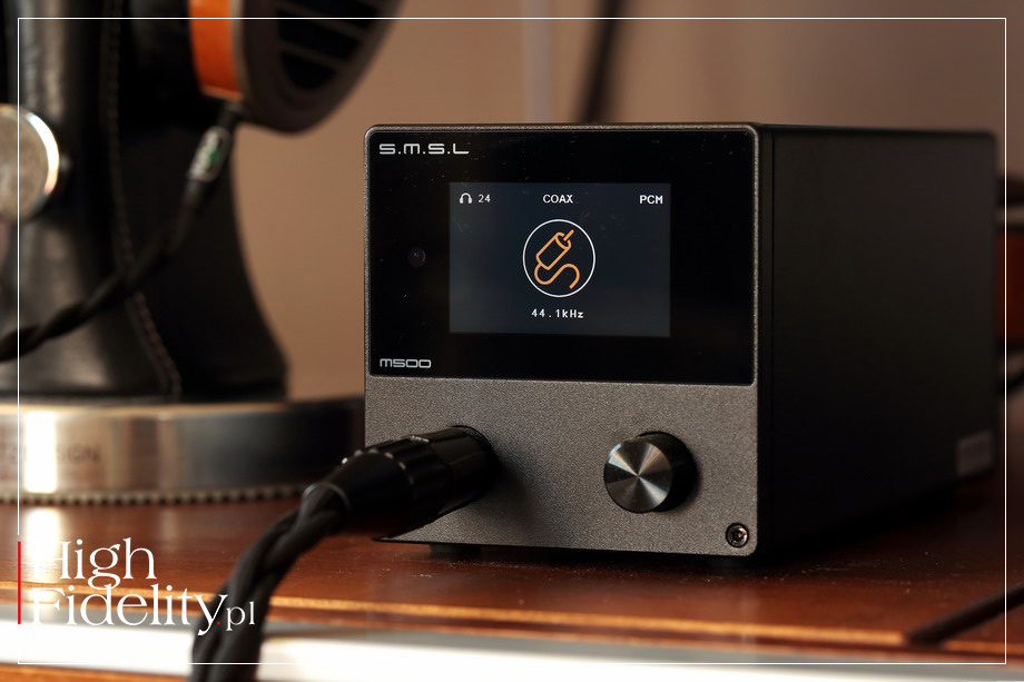 Słuchawki | Jeśli myślimy o testowanym urządzeniu głownie jak o wzmacniaczu słuchawkowym z „dakiem”, dostaniemy niemal to samo, co na wyjściu liniowym. Zarówno ze słuchawkami HiFiMAN HE-1000 v2, jak i z niskoomową wersją modelu DT-770 Pro firmy Beyerdynamic, jak wreszcie z niedrogimi słuchawkami dousznymi Focal Sphear, ze wszystkimi tymi słuchawkami dostałem ,b>ładny, pastelowy, ale i nieco bardziej niż przez kolumny, wykonturowany dźwięk. Barwa ze słuchawkami jest nieco wyżej, ale niewiele, dlatego nawet dość jasne Beyerdynamiki zagrały po prostu dobrze, a ciemniejsze AKG K702 po prostu świetnie. Wzmacniacz słuchawkowy w M500 ma bardzo dużą wydajność prądową, dlatego wysteruje dowolne słuchawki, nawet trudne pod tym względem planarne (magnetostatyczne) modele HiFiMANa. Basu nie będzie zbyt dużo, a przekaz oparty będzie głównie na środku pasma, ale będzie to dźwięk po prostu bardzo dobry. | Podsumowanie M500 firmy S.M.S.L jest zaskakująco dobrym produktem. Widzę, że będę się musiał nauczyć tego, że „zaskakujące” w przypadku najlepszych chińskich firm jest już słowem nieaktualnym, bo rzeczywistość o której mówię i która jeszcze kilka lat temu mogła by mnie zaskoczyć, jest nową normalnością. Przetwornik gra w świetny sposób, łącząc ładne barwy z dobrze rozłożoną przestrzenią. Nie ma w niej zbyt wiele głębi, jest za to rozległa panorama na osi lewa-prawa. Urządzenie nie jest specjalnie selektywne, nie nadaje się więc do rozbierania nagrań na części. Ale jest niebywale płynne i spójne, idealnie nadaje się więc do słuchania muzyki, także w długich sesjach. A do tego bardzo ładnie brzmi przez słuchawki, w znacznej mierze powtarzając to, co usłyszymy przez kolumny. Świetne urządzenie! | Budowa Przód i tył | M500 ma formę prostopadłościanu, postawionego na długiej ściance bocznej. Dlatego też z przodu widzimy jedynie niewielki, zgrabny przód, a całe urządzenie ginie nam z pola widzenia. Przód to aluminiowy element z wklejonym do niego hartowanym szkłem, pod którym widać kolorowy wyświetlacz TFT. Pokazano na nim duży symbol wybranego wejścia i maleńkie opisy – siły głosu, trybu (słuchawki czy wyście liniowe), jak również częstotliwość próbkowania. Wydaje się, że powinno być dokładnie na odwrót.