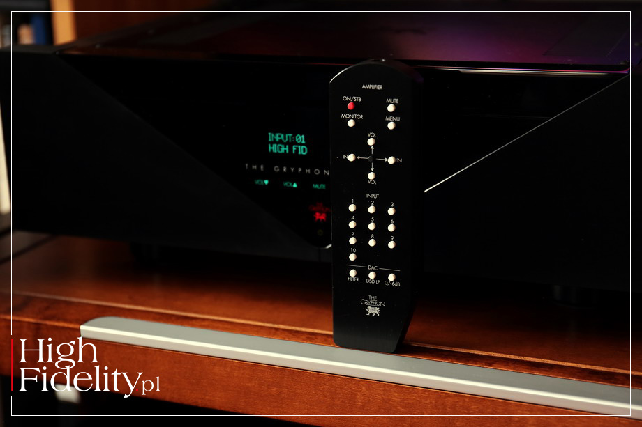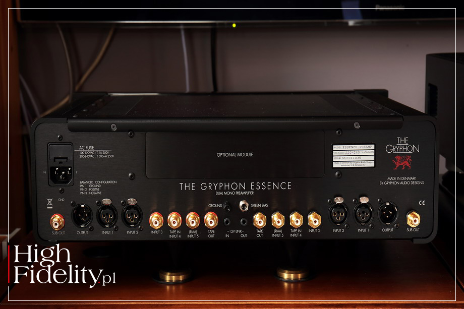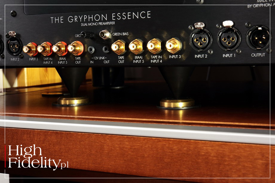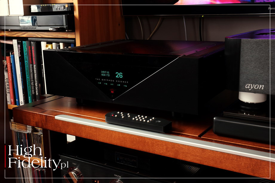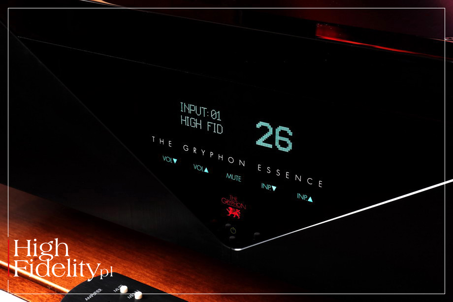 Przednia ścianka wciąż składa się z dwóch elementów: aluminiowego i akrylowego. Poprzednio miały one jednak układ Al-Ak-Al, z prostymi „ocięciami”, a w nowej akrylowy klin wcina się w aluminiowy front; klin ma kształt trójkąta równoramiennego z podstawą u góry. Po raz pierwszy motyw trójkąta w produktach tej firmy został wybrany na potrzeby odtwarzacza Compact Disc o nazwie ETHOS (test TUTAJ), który nagrodziliśmy, wspólnie z magazynem hifistatement.net, nagrodą STATEMENT in High Fidelity | GERMAN EDITION 2020 (więcej TUTAJ). Za projekt plastyczny odpowiedzialny jest założyciel firmy, Flemming E. Rasmussen. FUNKCJE Essence w swojej podstawowej formie jest przedwzmacniaczem liniowym wyposażonym w dwa zbalansowane wejścia XLR oraz trzy wejścia niezbalansowane RCA; wejścia XLR okablowane są zgodnie z EAS, czyli z pinem gorącym nr 2. Wejście nr 5 może pracować jako liniowe lub, po wyposażeniu przedwzmacniacza w odpowiedni moduł, jako wejście dla gramofonu lub źródła cyfrowego. Regulowany sygnał pojawi się na wyjściach zbalansowanych XLR i niezbalansowanych RCA. To ostanie oznaczone jest jako „Sub Out”, sugerując podłączenie do niego subwoofera, ale to po prostu wyjście liniowe, tyle że poprzedzone buforującym je układem scalonym. Na froncie przedwzmacniacza nie znajdziemy żadnych manipulatorów, a jednak jest on naprawdę funkcjonalnym produktem. Akrylowy front kryje bowiem duży dość duży, czytelny wyświetlacz VTF w kolorze zielonym, a pod spodem dotykowe przyciski, którymi zmienimy siłę głosu, wejście oraz siłę głosu. Pośrodku jest piękne, czerwone logo producenta. „Mózgiem” systemu jest mikroprocesor kontrolujący pracę urządzenia. Jak czytamy w materiałach firmowych, Gryphonowi udało się dzięki niemu wprowadzić do przedwzmacniacza „znakomicie działające i świetnie prezentujące się menu”, za pośrednictwem którego można między innymi spersonalizować nazwy wejść (do ośmiu znaków), ustawić pod kątem swoich preferencji poziomy głośności (startowy oraz maksymalny) czy jasność wyświetlacza (100/75/50/25% oraz wyłączony). Możemy także zmienić czułość wejściową wejść, a jedno z nich ustawić do pracy w kinie domowym (AV). Wspomnieliśmy o dodatkowych modułach – już wyjaśniam. Na tylnej ściance, blisko górnej krawędzi, widać podłużną, sporej wielkości zaślepkę, zamiast która kryje otwór dla jednego z dwóch obecnie dostępnych. Do Essence można dokupić przetwornik cyfrowo-analogowy Zena lub przedwzmacniacz gramofonowy PSC-2. DAC oferuje aż pięć wejść cyfrowych – w tym USB, AES/EBU, RCA (x2) i Toslink; USB akceptuje sygnał PCM do 24/384 kHz i DSD do DSD512. Przedwzmacniacz gramofonowy obsługuje wkładki MC i MM i pozwala zmienić impedancję obciążenia w granicach od 20 do 806 Ω; można również zamontować rezystor odpowiedni dla naszej wkładki. Na tylnej ściance znalazło się także gniazdo służące do połączenia przedwzmacniacza z końcówką mocy, opisane „GREEN BIAS”. Dzięki niemu możemy automatycznie regulować wartości prądu podkładu wzmacniacza mocy, w zależności od głośności. Zakres tłumika podzielono na trzy części, a dla każdego przypisano jedną z trzech wartości prądu podkładu tranzystorów końcowych wzmacniacza: 50%, 75% lub 100%. Przy cichym słuchaniu nie jest potrzebny wysoki bias, przydaje się ona dopiero przy dużym poborze prądu. To rozwiązanie oszczędza energię i spowalnia starzenie się komponentów. BUDOWA Przedwzmacniacz Gryphona został zbudowany w układzie dual mono, z dwoma transformatorami toroidalnymi. Zasilacz zajmuje zresztą dużą część wnętrza urządzenia i widać w nim ładne kondensatory, w tym polipropylenowe Wima i olejowe Mundorfa. Z toru sygnałowego Essence wyeliminowano kondensatory, dzięki czemu dysponujące on bardzo szerokim pasmem przenoszenia – od 0,1 do 1 MHz (bardzo podobnie zachowuje się Ayon Audio Spheris III).