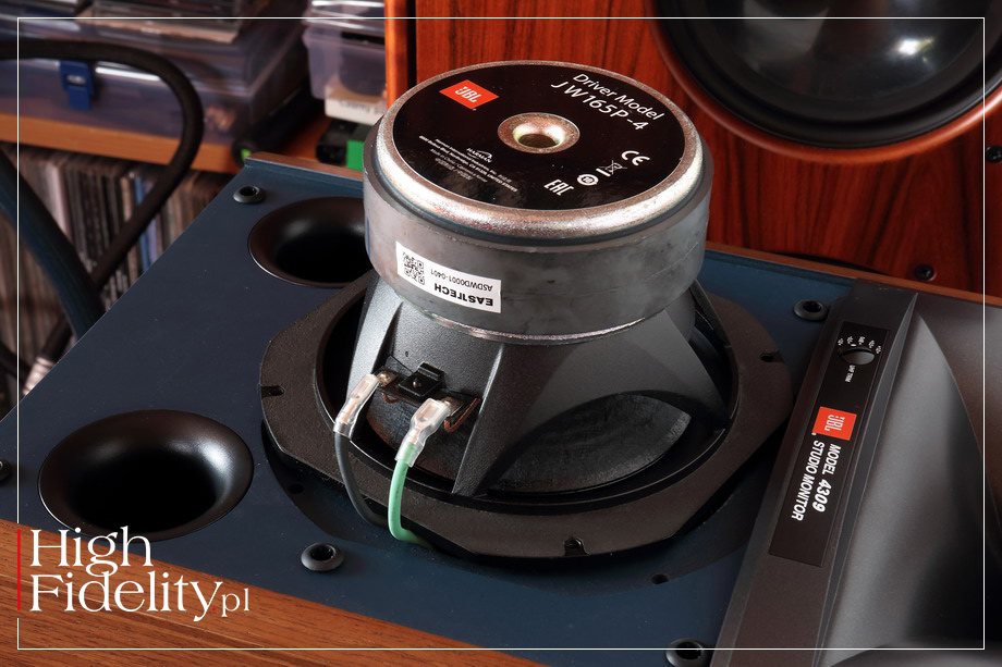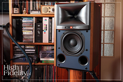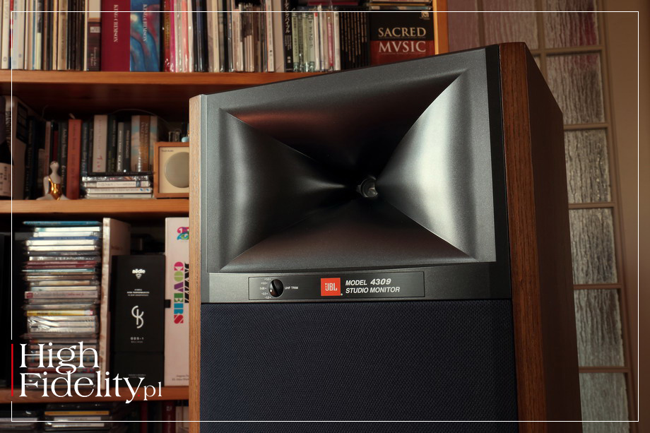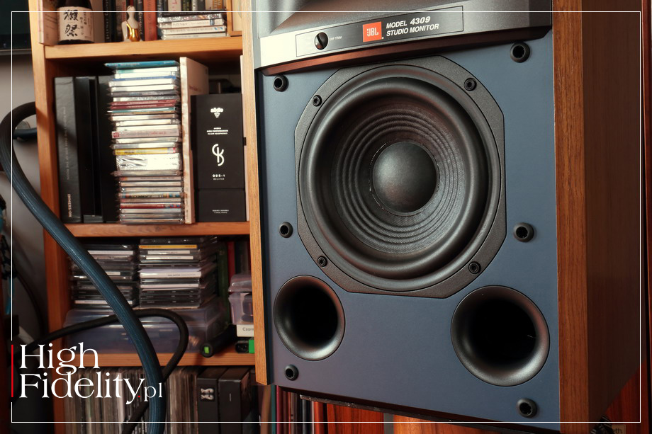 ▌ JBL 4309 JAK CZYTAMY W MATERIAŁACH PRASOWYCH, monitory JBL 4309 wzorowane są na większym modelu JBL 4349. Mówimy po niewielkich, mierzących 419 x 260 x 227 mm (wys. x szer. x gł.) i ważących 11 kg (szt.) kolumnach podstawkowych; mniejsze od nich w obydwu seriach „retro” są jedynie kolumny 4312 MkII. Mają one budowę dwudrożną, bas-refleks. Ich wygląd jest niesamowicie charakterystyczny i pod tym względem JBL ma przewagę nad konkurencją. ⸜ GŁOŚNIKI Wysokie tony w testowanych kolumnach obsługuje 25 mm (1”) przetwornik kompresyjny 2410H-2 dostosowany do współpracy z tubą High-Definition Imaging (HDI). Tuba służy zwykle do poprawy skuteczności kolumn, ale w tym przypadku nie jest to konieczne. Model 4309 ma bowiem niewielki głośnik niskotonowy i małe rozmiary, dlatego jego skuteczność jest niewielka – wynosi 87 dB, co przy impedancji nominalnej 4 Ω oznacza, że do ich napędzenia potrzebny będzie mocny, wydajny prądowo wzmacniacz. Dla porównania, wspomniany model 4312 MkII jest jeszcze mniejszy, nie ma tuby wysokotonowej, a mimo to jego skuteczność wynosi 92 dB, przy impedancji 6 Ω. Jak się wydaje, w kolumnach o mniejszych rozmiarach JBL stosuje tuby do dopasowania średnicy obydwu głośników – wysokotonowego i nisko-średniotonowego – a przez to do dopasowania ich charakteru. Wylot tuby ma powiem zbliżony rozmiar do membrany drugiego przetwornika. Chodziło również o to, aby bezpiecznie obniżyć punkt podziału zwrotnicy i przesunąć w dół pasmo przenoszenia głośnika wysokotonowego – w testowanym modelu to niskie 1,6 kHz. Głośnik wysokotonowy wykonany jest z bardzo lekkiej, okrągłej folii polimerowej (chodziło o małą masę) o firmowej nazwie Teonex i ma on konstrukcję opracowaną na potrzeby serii „D2” tego producenta, przeznaczonej do studiów nagraniowych. Membrana ma kształt litery V, dzięki czemu punkt „łamania” przeniesiono wysoko w górę pasma przenoszenia. Materiały firmowe mówią, że „rezultatem jest niesamowita dynamika z wiernym odwzorowaniem i brakiem kompresji mocy”. Pozostałą część średnicy oraz dół pasma obsługuje 165 mm (6,5”) głośnik ze sztywnym, odlewanym koszem i membraną z czystej masy celulozowej (papieru) z charakterystycznymi przetłoczeniami zwiększającymi jej sztywność. Zawieszenie jest klasyczne, gumowe. W jego konstrukcji zwraca uwagę długi skok z motorem o symetrycznym rozkładzie pola oraz miedzianymi pierścieniami, zmniejszającymi zniekształcenia liniowe, i układem stabilizującym pole magnetyczne. Kolumny strojone są dość nisko, ponieważ rura bas-refleksu jest dość długa – aby się zmieściła została zagięta pod kątem prostym i jej wylot wewnątrz skierowany jest ku górze. ⸜ ZWROTNICA Jedną z cech szczególnych kolumn firmy JBL należących do serii „Monitor Studio” jest stosowanie w nich pokręteł pozwalających dostosować ilość wysokich tonów do systemu i pomieszczenia. Tak jest i w modelu 4309. Do dyspozycji mamy przełącznik zmieniający ich poziom w pięciu krokach, od -1 dB do +1 dB. Producent informuje, że w tym układzie zastosował dobre podzespoły – drutowe oporniki, cewki powietrzne i kondensatory foliowe. I rzeczywiście, rzut oka do wnętrza potwierdza, że podzespoły są naprawdę niezłe. Wprawdzie w sekcji niskotonowej mamy dwa masowe oporniki, ale pozostałe są drutowe. Całość zmontowano na płytce drukowanej umieszczonej za głośnikiem wysokotonowym. Sygnał do kolumn doprowadzamy przez podwójne zaciski głośnikowe. Nie są one jakieś wyszukane i umieszczone są na plastikowej wytłoczce. Warto również pamiętać o wymianie złoconych blaszek na dobre zwory. Sygnał prowadzony jest wewnątrz grubymi plecionkami miedzianymi, łączonymi z głośnikami przez skuwki. ⸜ OBUDOWA Monitory JBL 4309 mają klasyczny dla tej serii, a kiedyś dla niektórych modeli studyjnych tego producenta, kolor przedniej ścianki. Na niebieskiej odgrodzie zamontowano niewielki głośnik nisko-średniotonowy i ten fragment obudowy można zamknąć maskownicą – niebieską lub czarną. Tuba nie jest zakrywana. Obudowę wykonano z 18 mm płyt MDF, a kolumny dostępne są w dwóch rodzajach naturalnych oklein – orzech amerykański lub w kolorze czarnym. Kolumny są wewnątrz usztywniane poziomym wieńcem, a ich ścianki wytłumiono wewnątrz filcem. Od spodu doklejono mały cokół, który lekko unosi kolumny nad podstawkami, co ładnie wygląda. Kolumny, wraz z głośnikami, wyprodukowano w Chinach. Kolumny wyglądają ładnie i są bardzo porządnie wykonane. Jedynie podwójne zaciski wyglądają, jak ze znacznie tańszych kolumn. ▌ ODSŁUCH ⸤ JAK SŁUCHALIŚMY Producent zaleca rozstawienie kolumn JBL 4309 z serii „Studio Monitor” w odległości od 1,8 do 2,5 m od siebie i w odległości ponad 50 cm od ścian bocznych. Warunek ten został spełniony, ponieważ kolumny stanęły w odległości 2 m od siebie (licząc od ich środka), lewa kolumna miała od panelu akustycznego Acoustic Revive 70 cm; od miejsca odsłuchowego front kolumn znalazł się w odległości 2,3 m. Co ciekawe, producent nie pisze nic o odległości od tylnej ściany, a na rysunkach umieszcza monitory blisko niej. W czasie testu stały one w odległości 70 cm, ale wydaje się, że optymalną odległością będzie 30-50 cm – bas będzie wówczas mocniejszy. Model 4309 jest nieco wyższy niż większość kolumn podstawkowych, mimo to producent sugeruje korzystanie z podstawek o wysokości 24”, czyli 609 mm, czyli klasycznych. Kolumny zasilane były przez wzmacniacz tranzystorowy Soulution 710 za pośrednictwem kabli Siltech Trilpe Crown. Kanały sprawdziłem korzystając z płyty FN/RR Test Disc III, o czym poniżej.