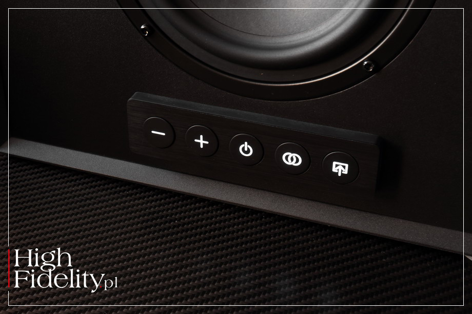BLUETOOTH JEST STANDARDEM bezprzewodowej komunikacji krótkiego zasięgu pomiędzy różnymi urządzeniami elektronicznymi. Opracowany został w latach 80. przez dr. STEPHENA SMYTHA jako część jego pracy doktorskiej na Queen's University Belfast School of Electronics. Za pomocą Bluetootha można przesłać dane pomiędzy klawiaturą, myszką komputerową itp., ale również sygnał muzyczny, na przykład między smartfonem i słuchawkami bądź głośnikiem bezprzewodowym. To obecnie najpopularniejszy sposób przesyłu sygnału muzycznego na krótkim dystansie. Kodeki Bluetooth są kodekami stratnymi, a oszczędność na paśmie przesyłu uzyskują dzieląc sygnał między różne częstotliwości – w wersji apt-X są cztery takie pasma. Bluetooth w swojej podstawowej formie nie gwarantuje wysokiej jakości dźwięku, ponieważ korzysta z kodeków SBC (sub-band codec). W 2009 roku firma Qualcomm zaproponowała modyfikację formatu o nazwie apt-X (apt = audio processing technology), która pozwala na przesył sygnału „o jakości CD”, a następnie, w 2016, apt-X HD, która z kolei umożliwia przesył sygnału wysokiej rozdzielczości do 24 bitów i 48 kHz. W 2018 roku do tej grupy doszła wersja apt-X HD Adaptive, dla sygnałów 24/96. Użyty przeze mnie cudzysłów mówi o tym, że to cytat z materiałów firmowych producenta i jednocześnie, że to tylko przybliżenie, a nie cała prawda. W rzeczywistości bowiem Bluetooth przesyła sygnał skompresowany. apt-X i jego odmiana HD pozwoliły poszerzyć pasmo przenoszenia i zwiększyć rozdzielczość sygnału, zmniejszając też zniekształcenia. Różnica między nimi i kodekami SBC jest ogromna, można więc przymknąć oko na tę hiperbolę. Tym bardziej, że dla zwykłych odbiorców to jest rzeczywiście wierne przybliżenie do CD i hi-res. ♦ ⸤ Więcej informacji: SOUNDGUYS.com; dostęp: 24.01.2022. STEROWANIEM GŁOŚNIKA ZARZĄDZAMY przez sparowany smartfon, komputer lub tablet, albo za pomocą pięciu, dużych, podświetlanych przycisków na przedniej ściance. Są one dość dyskretne i przeświecają przez maskownice – aby nimi operować nie trzeba jej ściągać! Zmienimy za ich pomocą siłę głosu, przejdziemy w tryb standby, włączymy tryb parowania i zmienimy aktywne wejście. Małym przełącznikiem na tylnej ściance wybierzemy tryb, w jakim głośnik będzie się włączał – automatycznie, po podaniu sygnału, czy manualnie.