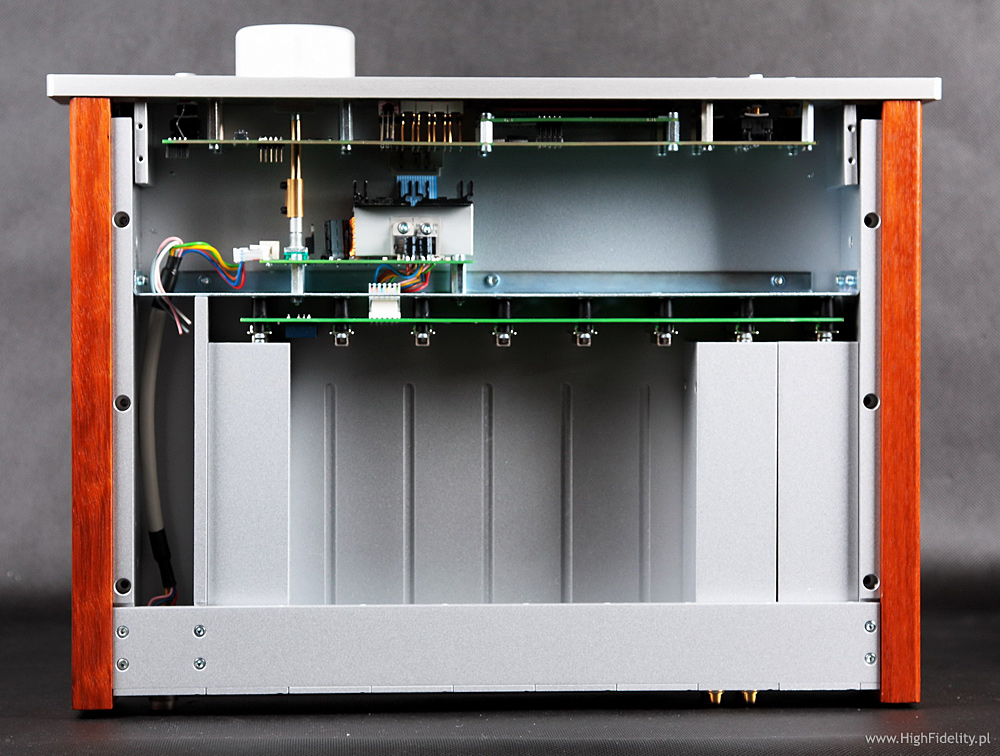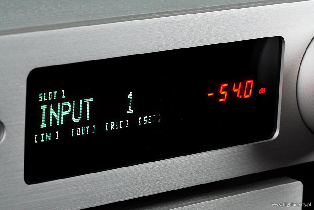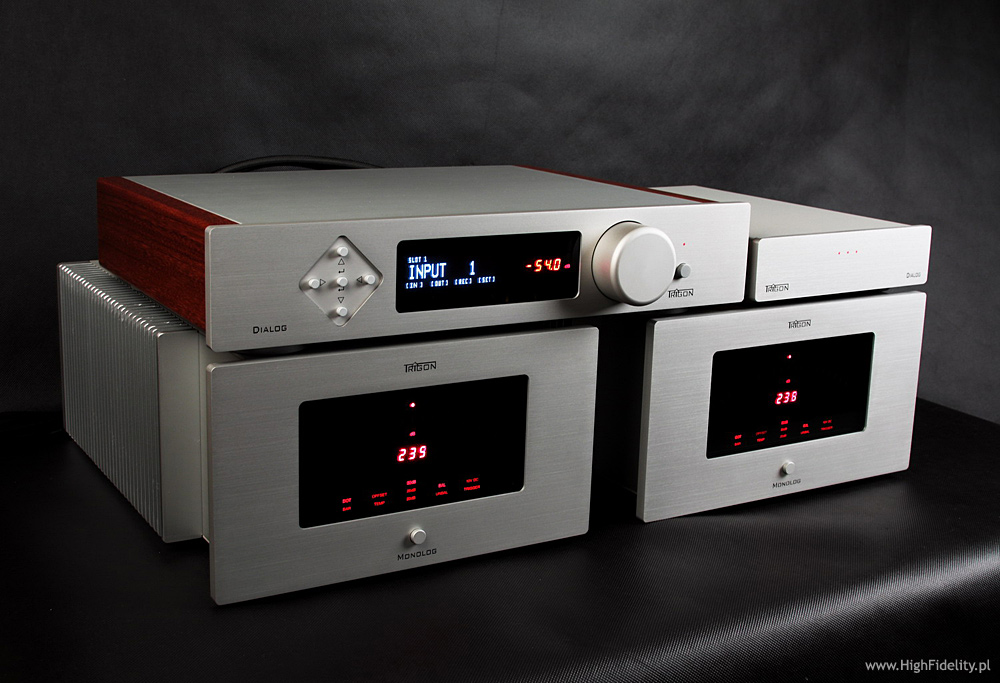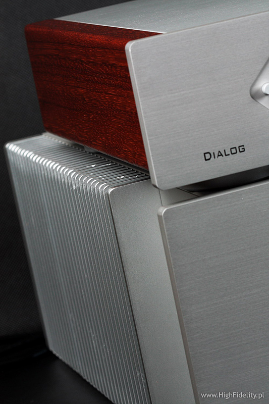 Obudowę właściwego przedwzmacniacza zmontowano z płyt aluminiowych. Z boków dodano drewniane elementy, które mają – najwyraźniej – uatrakcyjnić wygląd, przełamać industrialną wymowę całości. To sprawa indywidualna, ale mnie się wydaje, że to nie jest potrzebne. Na ściance przedniej widać przede wszystkim bardzo duży wyświetlacz ciekłokrystaliczny, na którym pokazywane są komunikaty dotyczące bieżącej pracy oraz ustawień menu. Duże literki pokażą wybrane wejście, a mniejsze ikonki np. wybrane wyjście do nagrywania (jeśli takowe jest, o czym zaraz), wyjście regulowane, balans, a także uaktywnienie funkcji mono. Obok umieszczono czerwone, charakterystyczne dla tego producenta wyświetlacze alfanumeryczne typu LED, na których ukazywana jest aktualna siła głosu w dB. Trochę kolory tych dwóch wyświetlaczy do siebie nie pasują, ale może po prostu się nie znam… Obok mamy dużą, niezwykle wygodną gałkę siły głosu z enkoderem (kręci się dookoła), a po drugiej stronie guziki, którymi obsługujemy przedwzmacniacz. Najważniejszą jego właściwością jest nawet nie wygoda obsługi, a modułowa budowa. Sprawa została „przećwiczona” w urządzeniach Cello, Burmestera, a także MBL-a, częściowo także u Accuphase’a, gdzie możemy dobrać dodatkowe karty, jednak nigdy na taką skalę i w takiej niespecjalnie wysokiej cenie. Tylna ścianka Dialoga jest bowiem w całości złożona z wykręcanych slotów i zaślepek. Urządzenie, które otrzymaliśmy do testu miało zamontowane zbalansowane wyjście, zbalansowane wejście oraz slot z dwoma niezbalansowanymi wejściami liniowymi RCA. Możliwe jest dodanie dodatkowych wejść, wyjść, wyjścia do nagrywania, zapewne także wejścia gramofonowego, a kto wie, czy i nie przetwornika D/A (to naprawdę sensowne rozwiązanie). Możliwości tak naprawdę sobą jednak nieograniczone i nie zdziwiłbym się, gdyby w przyszłości dostępny był moduł z dekoderami dźwięku kinowego wysokiej rozdzielczości, dzięki którym Dialog mógłby pracować z odtwarzaczami Blu-ray (w trybie stereo lub wielokanałowym). Poszczególne moduły są wykręcane i wpina się je wewnątrz do głównej „magistrali” za pomocą dużego, komputerowego łącza ze złoconymi pinami. Na wspomnianej płytce głównej są tylko przekaźniki i ścieżki łączące całość. Jest też druga płytka, gdzie umieszczono układy filtrujące i stabilizujące dla dużego mikrokontrolera. Ten ostatni jest na kolejnej płytce, tuż przy przedniej ściance. Poszczególne moduły mają dość prostą, ale bardzo ładną budowę i zapakowano je w bardzo sztywne, grube formy, stanowiące dodatkowy ekran. Slot z wejściami liniowymi oparty jest o dwa układy scalone Analog Devices AD8620, cztery przekaźniki i układ PIC16F88 Microchip – pamięć typu flash. Wersja zbalansowana od niezbalansowanej różni się tylko tym, że w tej pierwszej dwa scalaki obsługują dwa wejścia (cztery linie), a w drugiej cztery (także cztery linie). Układ wyjściowy jest nieco inny, choć też oparty jest o układy scalone i montaż SMD. Także tam podstawą jest pamięć flash tej samej firmy, tyle, że większa, w wersji PIC16F87. Najwyraźniej wraz z przetwornikiem D/A TLC7528 tworzą układ regulujący siłę głosu. Układ wzmacniający oparto na takich samych układach scalonych, jak wejście. Przed gniazdami XLR widać jednak kolejne układy – szerokopasmowe, bardzo szybkie kości wzmacniające THS6012, przeznaczone do sterowania długimi połączeniami. Całość wygląda wyjątkowo profesjonalnie i jest świetnie wykonana. Do przedwzmacniacza dołączany jest bardzo solidny, ładny – choć wyraźnie pochodzący z Chin – pilot zdalnego sterowania Director. MonologO wzmacniaczu mocy nie powiem tyle, co o preampie, ponieważ nie udało mi się go całkiem rozkręcić. Najpierw jednak to, co na zewnątrz. Monolog to monofoniczny wzmacniacz mocy, nie bardzo duży, ale bardzo ciężki. Na jego przedniej ściance umieszczono okno z czernionego akrylu, pod którym ukryto mnóstwo wskaźników o czerwonej barwie. Najbardziej widoczny jest bargraf z ułożonych po półokręgu elementów. Pośrodku mamy wskaźnik napięcia zasilającego, a pod spodem podświetlane kontrolki. Na tylnej ściance mamy bowiem całą gamę przycisków: możemy wybrać wejście zbalansowane XLR lub niezbalansowane, sposób wyświetlania mocy – np. z pozostawianiem świecącej się diody szczytowego wskazania, czułość wejściową (właściwie wzmocnienie całości) – 20/26/32 dB oraz wyłącznik do sterowania. Końcówki można bowiem spiąć ze sobą i z przedwzmacniaczem kabelkami CAT-5, które będą sterowały ich włączaniem. Z tyłu mamy duże rączki, które naprawdę przy przenoszeniu się przydają, wejście RCA i XLR – to ostatnie z przelotką, gdyby nam przyszłą ochota na bi-amping – bardzo ładne, solidne gniazda zaciskowe oraz gniazdo głośnikowe Speakon Neutrika, jak w profesjonalnych urządzeniach. I jest jeszcze gniazdo IEC z mechanicznym wyłącznikiem sieciowym.