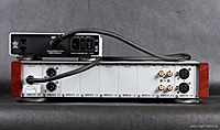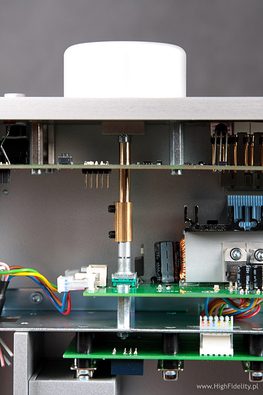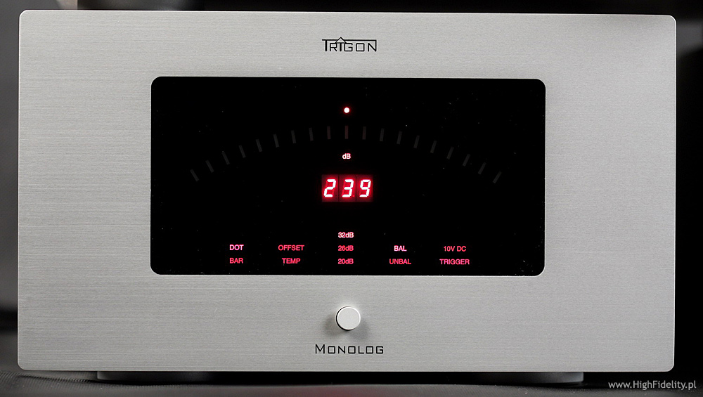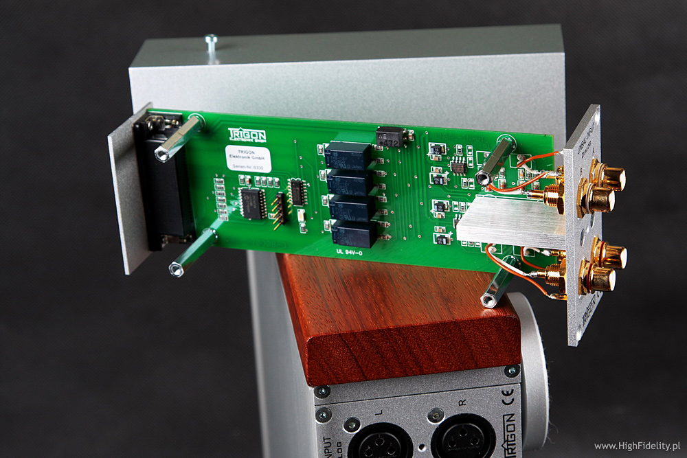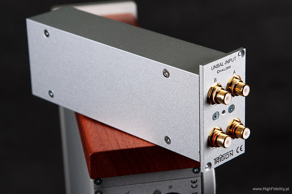 Co więcej – o ile mnie pamięć nie myli, Dialog jest wyraźnie bardziej wyrównanym przedwzmacniaczem niż testowany razem z końcówką Krella preamp EVO222. Z EVO402 był fenomenalny, jednak sam, w innym otoczeniu pokazywał podbicie na wyższym basie i części średnicy, co nie zawsze było pożądane i co stanowiło wyraźne odstępstwo od normy. Wydaje się też, że Luxman M-800A jest na wyższym basie nieco podbarwiony, tj. jest tam cieplej niż w najlepszych wzmacniaczach tego typu i niemiecki system ładnie to pokazał. Najbardziej zyskały na tym stare nagrania, jak np. Pery Como In Italy, Brilliant Corners Theleniousa Monka, a także Julie Is Her Name. Vol. 1 Julie London. Przy tym ostatnim krążku zmiana kolumn na Harbethy przyniosła najwięcej korzyści, bo z Dobermannami atak dźwięku, szczególnie w głosie, był nieco za twardy. Z Trigonem dźwięk miał duży wolumen i scena była naprawdę obszerna. O średnicy trudno powiedzieć coś złego. Oczywiście da się, bo nie jest ona tak nasycona, jak w systemie odniesienia (opis TUTAJ), ani też tak plastyczna, ale nie jest wcale źle. Jest równie dobrze, jak w zestawieniu końcówki Accuphase’a A-45 z przedwzmacniaczem C-2410 tej firmy. To zresztą podobna szkoła dźwięku. Trigon lepiej radzi sobie z niskimi dźwiękami i jest bardziej plastyczny na przełomie dołu i średnicy. Accu ma z kolei bardziej rozdzielczą górę i lepiej różnicuje akustykę nagrań. Najważniejsze jest wszakże co innego: to nie jest dźwięk tzw. „lampowy”. Nie ma tu żadnego zaokrąglenia, ocieplenia itp. Nieco cierpi na tym plastyka dźwięku i pewna „swoboda” w rysowaniu barw, ale takie jest życie: jedną ręką daje, a drugą zabiera. Niemiecki system jest bardzo dobrze zrównoważony tonalnie, ale trzeba pamiętać o tym, co pisałem o kolumnach. Nieco zabrakło w nim plastyki i rozdzielczości znanej mi z mojego systemu i z innych drogich systemów, ale ostatecznie nie jest to super-drogie zestawienie. Za te pieniądze jest bardzo dobrze. Użytkowanie Trigona to prawdziwa przyjemność, czego nie da się powiedzieć o wielu urządzeniach. Preamp to prawdziwa gwiazda i dzięki modułowej konstrukcji idealny wybór, bo i świetnie brzmi, i jest odporny na „starzenie się”. Końcówki są wyjątkowo udane, ale to właśnie one nadają całości taki, a nie inny charakter. Poprzednie systemy tej firmy grały znacznie cieplej, co w przypadku dzielonej kombinacji TRV-100 + TRE-50M, już nie takiej taniej, było wyraźnym odstępstwem od neutralności. To fajny dźwięk, ale nie tak dobry, jak tutaj. Wszechstronny, równy, ładny – czegóż chcieć więcej? Chyba tylko równie udanego odtwarzacza tej firmy, bo Recall II to trochę nie ta liga. BUDOWADialog Przedwzmacniacz Dialog firmy Trigon (Trigon Elektronik GmbH) jest jednym z najciekawszych urządzeń tego typu, z jakim zetknąłem się w ostatnim czasie. Nie jest to ulepszona wersja preampu TRV-100, a zupełnie nowa konstrukcja. Już wygląd Dialogu mówi, że to coś wyjątkowego. Urządzenie podzielono na dwie części – w głównej znajduje się układ wzmacniający i część układów stabilizujących napięcie, a w drugim zasilacz z transformatorami. Zasilacz jest niewielki, ale nie potraktowano go „ulgowo”: ma solidną, aluminiową, bardzo ładną obudowę z frontem, jak w głównym urządzeniu. Na przedniej ściance umieszczono trzy czerwone diody sygnalizujące poszczególne napięcia, a całość postawiono na antyrezonansowych nóżkach. Ponieważ takie same (o innej podatności i wielkości) mają też wszystkie pozostałe urządzenia tej firmy, powiedzmy o nich słowo, albo dwa. To pomysł własny Trigona, oparty na prostej konstrukcji: do sztywnej, aluminiowej obręczy mocowana jest „membrana” z przezroczystego plastiku, dość podatna, pośrodku której zamontowano śrubę mocującą całość do metalowego dystansu, a ten do dolnej ścianki. Pod spodem przyklejony jest element z filcu, który zapobiega rysowaniu podłoża. Proste i fajne. Zasilacz połączony jest z główną częścią grubym przewodem, zakończonym zakręcanym, wielopinowym wtykiem DIN. Prawdę mówiąc, wolałbym tu widzieć jakiś lepszy wtyk.