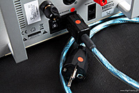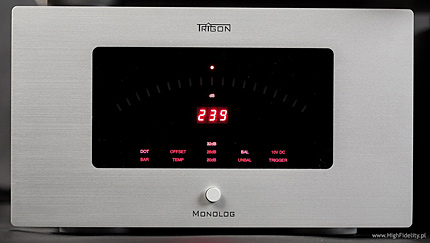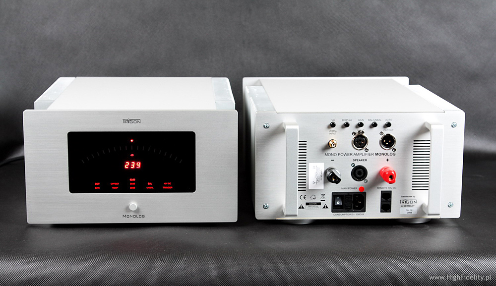 Po obydwu stronach urządzenia widać duże radiatory, które mają co chłodzić – wzmacniacz ma oddać aż 650 W przy 4 Ω. Po odkręceniu dolnej ścianki okazało się, że aby dostać się do środka trzeba jeszcze odkręcić górną, jednak nie miałem wystarczająco długiego torxa, więc mi się to nie udało. Od spodu widać grubą płytę, na której całość jest zamontowana. To do niej przykręcone są dwa, potężne transformatory toroidalne. Najwyraźniej Monolog jest urządzeniem zbudowanym w mostku, a więc złożonym z dwóch identycznych wzmacniaczy, stąd dwa trafa. Zarówno do przedwzmacniacza, jak i do końcówki mocy dołączane są standardowo znakomite kable sieciowe Trigona o nazwie Volt. Zaznaczono na nich na czerwono „gorące” piny i najlepiej się tego trzymać. Dane techniczne (Monolog, wg producenta) |