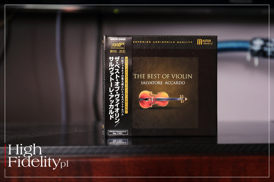 PŁYTA The Best of Violin zbiera najlepsze, zdaniem Fonè Records, utwory zarejestrowane dla tej włoskiej wytwórni przez SALVATORE ACCARDO, włoskiego wirtuoza skrzypiec, który zasłynął nagraniem Czterech pór roku Antonio Vivaldiego dla Philipsa; audiofilom znana jest ona z wydania na krążku XRCD. Brzmienie jego instrumentu jest wyjątkowe, ponieważ gra on na skrzypcach Guarnerius Il Cannone, wykonanych przez Giuseppe Antonio Guarneri Bartolomeo, del Gesù. Zbiór o którym mowa w 2010 roku wydała Fonè Records, dla której Accardo nagrał kilka płyt. A jest to wydawnictwo znane z purystycznego podejścia do dźwięku i ze świetnych wykonawców, specjalizujące się w muzyce klasycznej. 7 maja 2021roku krążek został poddany remasterowi w studiach JVC Mastering Center, przez pana TOHRU KOTETSU i wydany przez japońską wytwórnię Master Music na krążku XRCD24. MASTER MUSIC jest częścią firmy Combak Corporation. Zapewne miłośnikom muzyki niewiele ona mówi, ale audiofile powinni ją lepiej kojarzyć. Pod tym parasolem znajdziemy marki Reimyo, Bravo!, Harmonix, Hijiri i właśnie Master Music. Znamy je wszystkie z „High Fidelity”, a i sam pan KAZUO KIUCHI, jej właściciel, gościł w Krakowie na zaproszenie Krakowskiego Towarzystwa Sonicznego (więcej TUTAJ). Wersja o której mowa pokazuje, w którym kierunku idzie współczesna technika masteringowa. Otóż materiał został dostarczony do studia JVC w formie plików cyfrowych. Pierwszym krokiem była zamiana cyfry na analog w przetwornikach D/A K2, konstrukcji JVC. Remaster miał zatem miejsce w domenie analogowej, przy użyciu wykonanego dla JVC miksera i urządzeń masteringowych. Po czym sygnał został zamieniony na cyfrowy, w postaci 24/176,4 (K2). To dlatego przy logo XRCD24 przeczytamy „24 bit refined digital”.