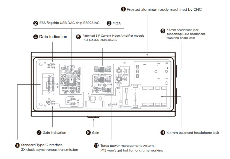 Co by jednak nie mówić, teraźniejszość i przyszłość odtwarzania muzyki w ujęciu masowym należy do plików. Choć początkowo wydawało się, że będzie to dotyczyło tylko komputerów, to wraz ze wzrostem mocy obliczeniowej procesorów, spadku ich cen i mniejszych wymogów związanych z poborem prądu, coraz większą przestrzeń zaczęły zagarniać dla siebie produkty mobilne (przenośne), bazujące na smartfonach, tabletach, głośnikach bezprzewodowych i na przenośnych odtwarzaczach plików. Choć wszystkie te elementy były znane technice od dawna, to w ostatnich dwóch-trzech latach zmieniło się sporo, przede wszystkim jeśli chodzi o sposób „konsumpcji” muzyki. Zamiast gromadzenia plików w danym urządzeniu czy na zewnętrznych nośnikach pamięci, ponad 90% (dane za 2021 rok) muzyki ściągane jest obecnie z serwisów streamingowych, przede wszystkim Spotify, Apple Music, a w przypadku audiofilów Tidal oraz Quobuz. A do ich odtwarzania potrzebne są niewielkie, mobilne urządzenia, z przetwornikami D/A i wzmacniaczami słuchawkowymi na czele. Jednym z nich jest M15 chińskiej firmy Questyle Audio. ▌ Questyle M15 QUESTYLE M15 JEST PRZENOŚNYM PRZETWORNIKIEM cyfrowo-analogowym i jednocześnie wzmacniaczem słuchawkowym; te dwie sekcje nie mogą bez siebie współpracować. Urządzenie jest stosunkowo niewielkie, mierzy 61,8 x 27,2 x 12 mm, ale trudno o nim mówić „małe”. Ze smartfonem, tabletem czy komputerem łączy się poprzez krótki kabelek zakończony wtykami USM i UCB-C. Kabelek jest dość sztywny i raczej zbyt często bym go nie zginał. Przetwornik akceptuje sygnał PCM do 32-bitów, 384 kHz oraz DSD do DSD256. Potrafi także rozpakować drugą część plików MQA, pod warunkiem, że pierwszą rozpakuje urządzenie, do którego zostanie podłączony (MQA Core) – takie działanie nazywane jest renderowaniem MQA. M15 współpracuje z systemami operacyjnymi Android od 5.0, Windows 10 (wersja 1803 lub wyższa), Apple macOS, iPad (wymagany przewód OTG USB-C do Lightning) oraz iOS (wymagany przewód OTG USB-C do Lightning). Sygnał do słuchawek wypuszczamy dwoma gniazdami słuchawkowymi – klasycznym mini-jackiem ø 3,75 oraz łączem zbalansowanym Pentaconn ø 4,4 mm. Układ elektryczny jest naprawdę wysokiej próby, ponieważ zastosowano w nim najwyższy typ przetwornika D/A, model ES9281A PRO, firmy ESS Technology w wersji przeznaczonej do urządzeń mobilnych, model ES9281A PRO, firmy ESS Technology. Jest to stosunkowo nowy, bo wprowadzony do sprzedaży w kwietniu zeszłego roku, 32-bitowy układ z rodziny SABRE. Kość została wyposażona we wzmacniacz słuchawkowy, co znacząco upraszcza układ. Takie rozwiązanie jest jednak obarczone problemami, takimi jak mała wydajność prądowa. Questyle zastosowała więc dodatkowe układy wzmacniające, po jednym na kanał. Są to układy wzmacniające prądowe, co wyróżnia M15 na tle innych przenośnych DAC/AMP-ów. Current Mode Amplification (CMA), czyli wzmacniacz prądowy użyty w tym przetworniku jest opatentowanym rozwiązaniem firmy Questyle, które znane jest z jej desktopowych DAC-ów i przenośnych odtwarzaczy audio. Charakteryzuje się ono niewielkim rozmiarem, pracą przy niskim napięciu i bardzo niskim poborem energii. Jego cechą szczególną jest też bardzo niski szum tła wynoszący -130 dB (dla wyjścia zbalansowanego 4,4 mm) oraz -125 dB dla wyjścia mini-jack. M15 wyposażony jest w dwa moduły wzmacniacza CMA SiP, co oznacza, że mamy aż cztery układy wzmacniające, a co za tym idzie na wyjściu Pentaconn otrzymujemy sygnał zbalansowany. Technika Current Mode Amplification charakteryzuje się, jak czytamy w materiałach prasowych, bardzo niską impedancją oraz niezwykle niskim poziomem zniekształceń, który wynosi jedynie 0,0003 %. Co więcej, napięcie wyjściowe jest wyjątkowo wysokie. Przypomnijmy, że wzmocnienie prądowe w swoim pełnowymiarowym wzmacniaczu słuchawkowym HPA-21 firma Bakoon (test TUTAJ). | Current Mode Amplification ⸜ za: www.QUESTYLE.com M15 JEST BARDZO SOLIDNIE zbudowanym urządzeniem. Jego obudowę wykonano z aluminiowego frezu, a górną ściankę zamknięto płytką z hartowanego szkła. Mamy więc możliwość przypatrzenia się „wnętrznościom”. Pod szybką widać również dwie diody świecące. Jedna wskazuje na wybrane wzmocnienie, a druga na typ sygnału cyfrowego. DAC Questyle oferuje dwa poziomy wzmocnienia, dzięki czemu dostosujemy je do posiadanych słuchawek. Niskie sygnalizuje kolor zielony, a wysokie czerwony. Z kolei zieleń drugiej diody mówi o sygnale PCM o częstotliwości próbkowania 44,1 lub 48 kHz. Kolor czerwony informuje o bezstratnym sygnale hi-res PCM 88,2 kHz~384 kHz lub DSD64~DSD256. I wreszcie fioletowa wskazuje na sygnał MQA Core.