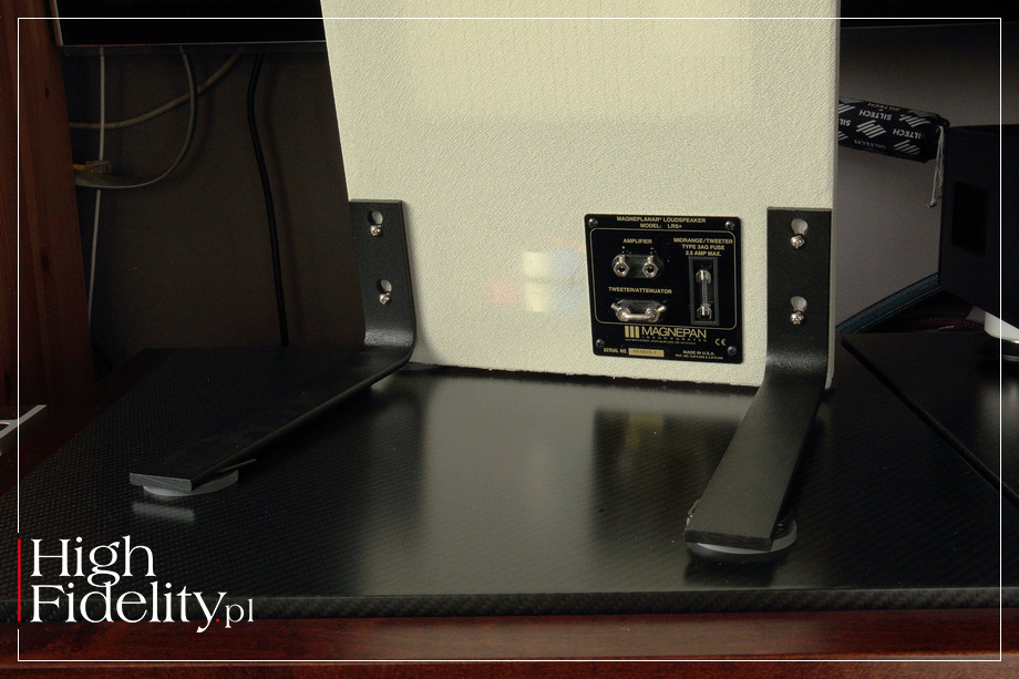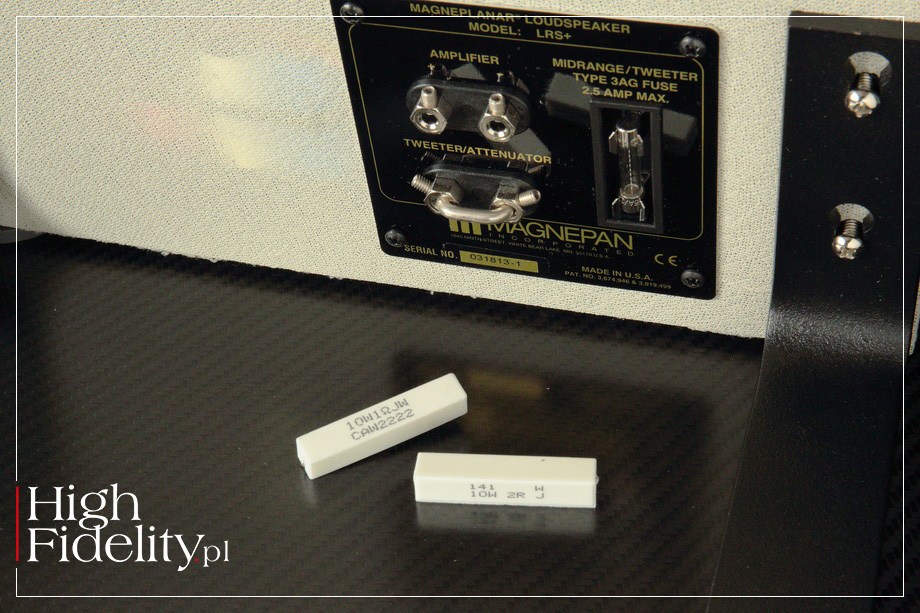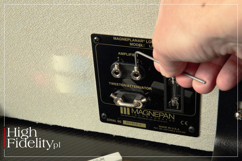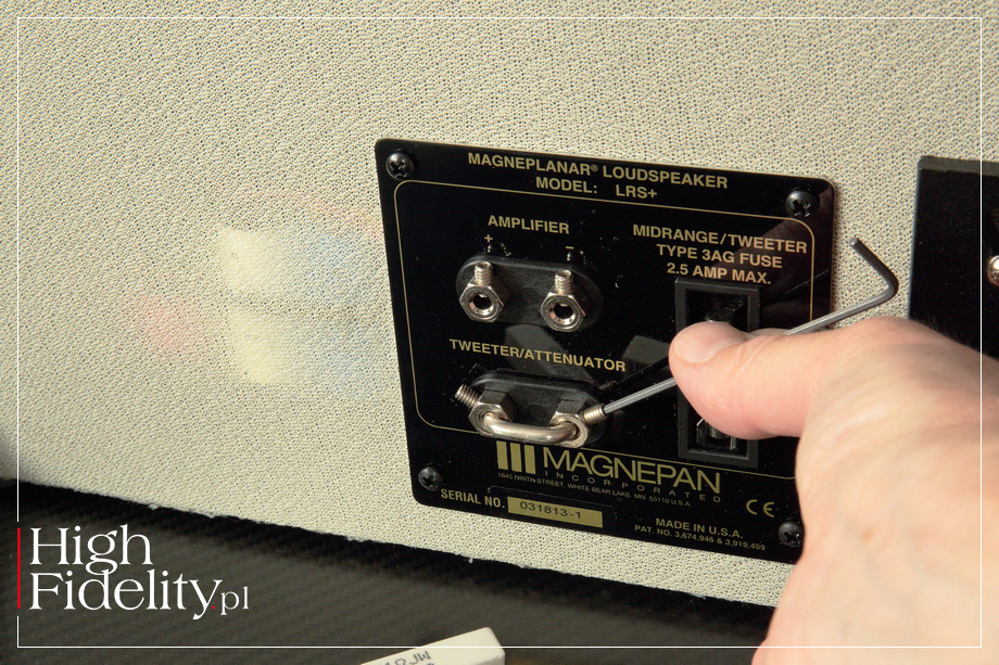 Przede wszystkim zamiast przetworników dynamicznych do poruszania powietrza i zamiany energii elektrycznej na mechaniczną (falę dźwiękową) wykorzystują one długie, płaskie paski folii aluminiowej umieszczone w polu magnetycznym – mówimy wówczas o przetworniku wstęgowym – lub płaską strukturę, najczęściej z folii mylarowej, na której naparowano ścieżki z aluminium – mowa wówczas o przetworniku quasi-wstęgowym. Do metalowych wstęg przykłada się sygnał, dzięki czemu poruszają się one w przód i w tył. Głośniki wstęgowe mają budowę dipolową, emitują więc dźwięk do przodu i do tyłu. Aby mogło do tego dojść należało opracować mocne magnesy w postaci pionowych pasków. Jim Winey, założyciel Magnepana, wykorzystał do tego swoje doświadczenie jeszcze z firmy M3, w której zaczynał karierę. Jak wspomina, w połowie lat 60. pracował w niej nad dwustronnymi laminatami w postaci taśmy z warstwą magnetyczną, które miały służyć do szczelnego domykania drzwi w lodówkach. Były one pokryte materiałem magnetycznym o nazwie Core-Seal, produkowanym przez firmę BF Goodrich. Tak przyszedł mu do głowy pomysł, aby wykorzystać je w kolumnach głośnikowych. Prototyp powstał w suterenie jego domu w ciągu jednej nocy. Pokazał go swoim kolegom w M3, którzy podrzucili mu kolejny materiał z warstwą magnetyczną, Plast-Form, tym razem produkowany przez firmę, którą 3M właśnie przejęła. Szefowie firmy zaproponowali Jimowi odkupienie pomysłu, ale ten postawił jeden warunek: oprócz zapłaty będzie miał udział w zyskach. Firma odmówiła, więc 28 czerwca 1969 roku Jim Winey zwolnił się i skupił się na jednym: prototypie kolumn. Dzięki pomocy, między innymi, Billa Johnsona, założyciela Audio Research Corporation, firma mogła zacząć działać. ▌ LRS+ LRS+ TO KOLUMNY MAGNETOSTATYCZNE, najmniejszy model wśród pełnopasmowych konstrukcji tej firmy. Za jego konstrukcją stoi Wendell Diller, który zastąpił założyciela Magnepana, Jima Winey’a, na pozycji głównego inżyniera, kiedy ten udał się na emeryturę. Mają one budowę dwudrożną i każda z kolumn to płaski, gruby na zaledwie 20 mm, panel pochylony do tyłu za pomocą metalowych nóżek. Zostały one obciągnięte materiałem – w teście był on koloru ecru, ale może być też szary lub czarny. Pierwsze modele Magnepana miały przetworniki wstęgowe. To jednak kosztowny sposób produkcji kolumn, dlatego kiedy firma zaproponowała tańsze modele, zamiast aluminiowych pasków umieszczonych w polu magnetycznym pionowych prętów zastosowała rozwiązanie o nazwie quasi-ribbon. Na 0,0005” folii z materiału o nazwie Mylar, naniesione są w nim ścieżki aluminiowe o grubości 0,001”. Pierwszą konstrukcją Magnepana, w której wszystkie przetworniki miały budowę pseudo-wstęgową był model MG1.7 z 2010 roku. Testowane przez nas kolumny LRS+ są ich mniejszą wersją i zastępują, produkowane w latach 2018-2022 LRS, a te z kolei zastąpiły model MMG. LRS to skrót od Little Ribbon Speaker i odnosi się do rozmiarów tych konstrukcji: 1220 x 320 mm. Są one naprawdę niewielkie, co ułatwia ich ustawienie w pokoju, ale też wpływa na ilość reprodukowanego przez nie basu. Konstrukcje dipolowe mają bowiem to do siebie, że fale dochodzące z tyłu i z przodu w pewnym zakresie częstotliwości się znoszą. O ile wysokie i średnie tony są kierunkowe, o tyle bas już nie. Im szerszy panel, tym niżej kolumny schodzą z niskimi tonami. Przy szerokości 320 mm to będzie dość wysoko. Wprawdzie producent podaje pasmo przenoszenia od 50 Hz do 22 kHz, to bez spadku na skrajach. W rzeczywistości, jak zakładam, spadek -3 dB zaczyna się już poniżej 100 Hz. Ważne jest, aby panele były ustawione tak, aby dźwięk dochodził z nich do naszych uszu prostopadle od ich powierzchni. Należy więc pochylić je w taki sposób, aby góra i dół znajdowały się w podobnej odległości od nas. Do paneli dokręcamy po dwie metalowe nóżki na kanał, które pozwalają je pochylić. Są na nich zamocowane metalowe elementy, którymi lekko korygujemy kąt, ale warto w przyszłości pomyśleć o jakimś lepszym rozwiązaniu. Sygnał doprowadzamy do pojedynczych zacisków głośnikowych. Nie są to jednak zaciski, jakie znamy dzisiaj, a reminiscencja rozwiązań jeszcze z lat 40. XX wieku, czyli niklowane dziurki z wkrętami mocującymi, którymi domyślnie mocujemy gołe druty bez izolacji. Na szczęście mają one średnicę umożliwiającą skorzystanie z bananów lub wtyków BFA. Obok jest jeszcze jedna para takich zacisków – tym razem ze zworą. To część systemu „tuningującego”.