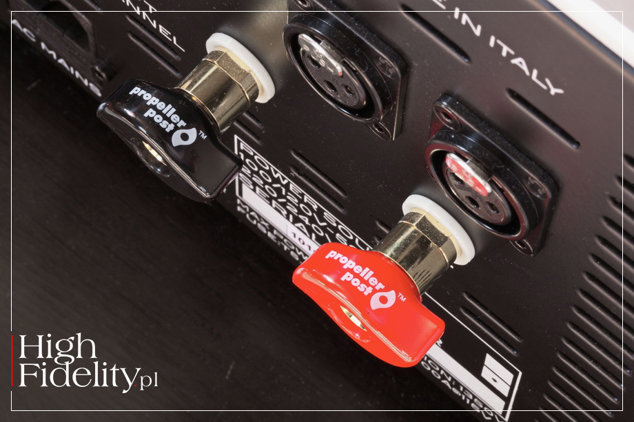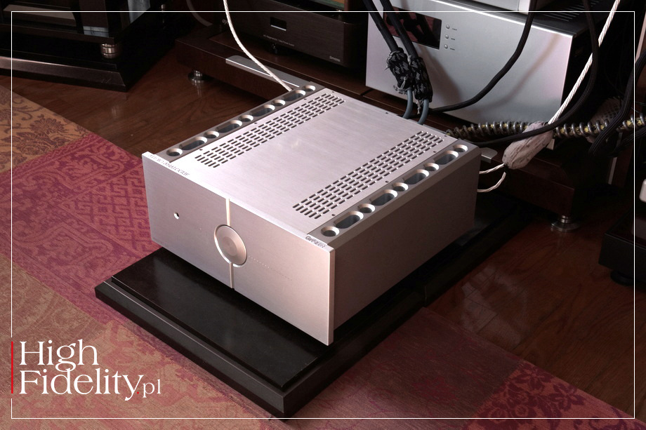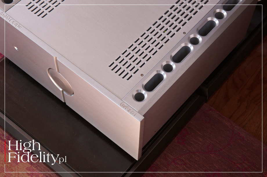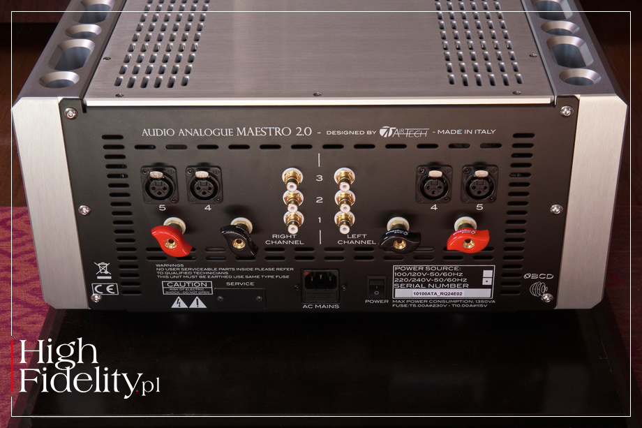 Wokale są pokazywane w dużej skali, są pełne, duże, gęste. Nie są przy tym rzucane „na twarz”. Jak wspomniałem, wyższa część środka pasma jest uspokojona, nieco w cieniu jego niższego zakresu i błyszczącej góry, To jest właśnie coś, co nadaje brzmieniu tego włoskiego wzmacniacza polor, dystyngowany wyraz, nie gasząc dynamiki i ekspresji. Mowa o ekspresji trzymanej na wodzy, bez ekscesów i wyskoków. Kiedy trzeba, jak w ˻ 1 ˺ Almost Like Being in Love, dźwięk uderza szybko, mocno, zwinnie. Ale nawet wówczas najważniejszy pozostaje wokal Sinatry i to on ustawia cały przekaz, to wokół niego koncentruje się nasza uwaga. Co jest o tyle ciekawe, że przecież włoskie urządzenie jest potężnym wzmacniaczem, a tego typu działanie kojarzymy raczej ze wzmacniaczami lampowymi małej mocy, bardziej 300B niż KT150. Najbliżej temu graniu, tak sobie myślę, do najlepszych urządzeń korzystających z lamp EL34 i KT88, ale z lepiej kontrolowanym, niżej schodzącym basem. Z którym Maestro 2.0 daje sobie radę doskonale. Kiedy w utworze Traitor ZOE WEES wszedł ten potężny, gęsty, elektroniczny niski dźwięk, został on pokazany przez wzmacniacz w całej pełni i potędze. Testowany wzmacniacz pokazał raczej jego podtrzymanie, gęste „jądro”, bez wyraźnie wprowadzanego ataku – to, ostatecznie, ciepłe granie. Ale też wysoka moc pozwoliła świetnie skontrolować jego wybrzmienie. A do tego oddać potęgę tego utworu, jego szerokość dynamiczną i rozmach sceny dźwiękowej. Ta jest szeroka i głęboka, a pierwszy plan jest tuż za linią łączącą głośniki. To ciekawe, ponieważ ciepłe urządzenia mają tendencję do wypychania go w naszym kierunku. Tutaj, nawet z tak intymnym przekazem, jak ten w utworze Foxes in the Snow JASONA ISBELLA, miałem przed sobą duży obraz, obraz intymny, ale w pewnej odległości. Słychać było to tak, jakby mikrofon był przysunięty bliżej gitary, a nieco odsunięty od wokalu. Jak gdyby urządzenie grało w taki sposób, aby zbalansować to, co intymne z potrzebną nam „przestrzenią własną”, do której nie chcemy nikogo wpuszczać. ▌ Podsumowanie ZAGRAŁEM Z TESTOWANYM WZMACNIACZEM nie tylko spokojne kawałki, ale i mocne, dynamiczne, rockowe, drapieżne. Wszystkie zabrzmiały zjawiskowo ładnie. Nie było też wątpliwości, że to urządzenie grawitujące w kierunku ciężkich, nasyconych brzmień o raczej długim czasie trwania. A jeśli już, to do grania akustycznego, takiego jak na płytach Sinatry i Isabella. Świetnie radzi sobie z nowoczesnym rockiem indie, wspaniale zagrał DOUBLE WISH w utworze Seatbelt (Deeper Ecstasy) i ze starszą elektroniką. Jego brzmienie jest ciepłe, ale i energetyczne. To duży, rozległy przekaz o dużej głębi. Nie jest specjalnie selektywny i raczej „ogarnia” całość niż wchodzi między dźwięki. Góra pasma jest otwarta, nie chodzi o jej wygaszenie. Jest jednak słodka i „złota”, co wraz ze zgaszeniem jaskrawego wyższego środka daje wrażenie elegancji i gładkości. Pozwala też na granie dowolnej muzyki bez problemów z barwą. Będzie to lekkie ujednolicenie, ale takie, które spodoba się wielu zmęczonym wiecznymi poszukiwaniami, problemami na zewnątrz i zgiełkiem dnia. ▌ BUDOWA CAŁA OBUDOWA WZMACNIACZA Maestro 2.0 wykonana została z grubych aluminiowych elementów, mających fakturę surowego metalu. To sztywna struktura, wzmacniana grubymi aluminiowymi radiatorami po bokach, a także wewnętrznymi ekranami. PRZÓD I TYŁ • Urządzenie o którym mowa ma bardzo czystą i przejrzystą ściankę przednią. Pośrodku umieszczono dużą gałkę siły głosu optycznie dzielącą, wraz z pionowym frezem, całe urządzenie na dwie części. Co dobrze oddaje budowę wewnętrzną, dual mono. Po obydwu stronach umieszczono mikrodiody LED w kolorze białym; czerwona jest tylko dioda wskazująca „uśpienie” urządzenia (standby). Gałka działa również jako wyłącznik. Symetryczny jest również podział gniazd na tylnej ściance i to w dosłownym znaczeniu – lewa i prawa strona są swoimi lustrzanymi odbiciami. W czym przypomina sposób w jaki gniazda rozmieszcza firma Gryphon. Bliżej środka mamy więc trzy pary gniazd RCA, a po bokach dwa XLR. Poniżej tych ostatnich znalazły się wysokiej klasy zaciski głośnikowe – zresztą wszystkie gniazda są naprawdę dobre. Poniżej jest jeszcze gniazdo zasilające IEC z zaznaczonym pinem „gorącym”. Warto na to zwrócić uwagę.