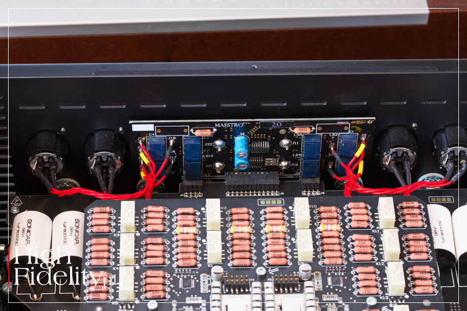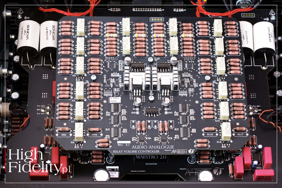 ŚRODEK • O ile z zewnątrz urządzenie jest niemal całkowicie symetryczne, nie licząc układu diod, o tyle wewnątrz ma ono wspólną płytkę tłumika rezystorowego. Audio Analogue postanowiło wykonają w „starym styku”, to znaczy za pomocą klasycznych oporników. No, może nie aż tak klasycznych, bo metalizowanych, precyzyjnych oporników firmy Dale. Wspólna jest również płytka wejściowa z przekaźnikami. Również i pozostałe układy, czyli przedwzmacniacza, wzmacniacza mocy i zasilacza, mają wspólne płytki, ale te są już symetryczne. Także i na nich widać oporniki Dale’a, jak i kondensatory Wima. Sprzęgnięcie między sekcją tłumika i przedwzmacniacza zapewniają polipropylenowe kondensatory Sonicap Gen 1, o których czytamy: