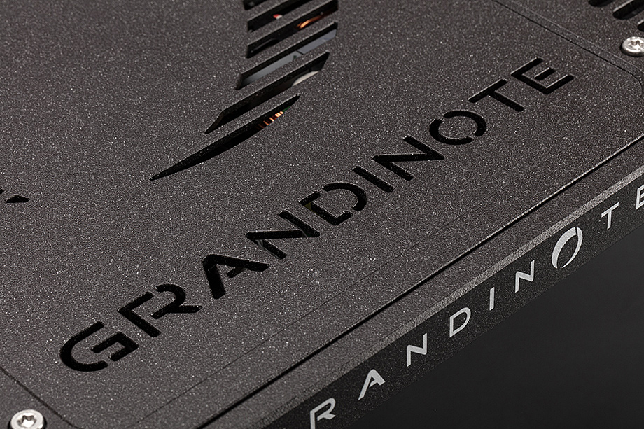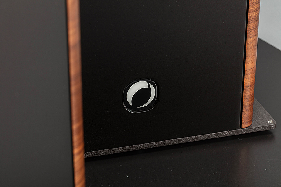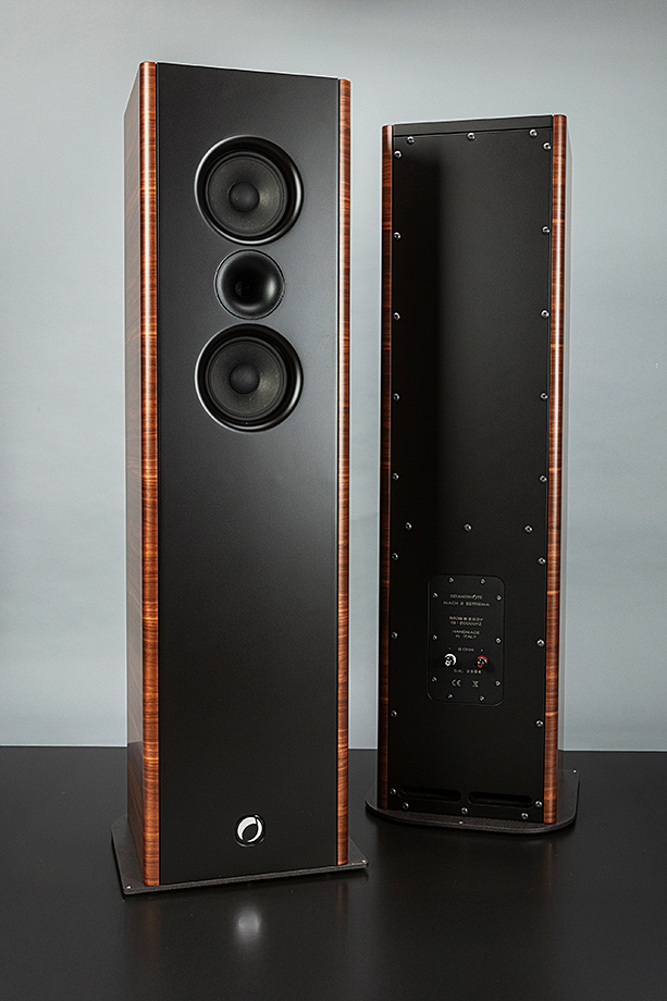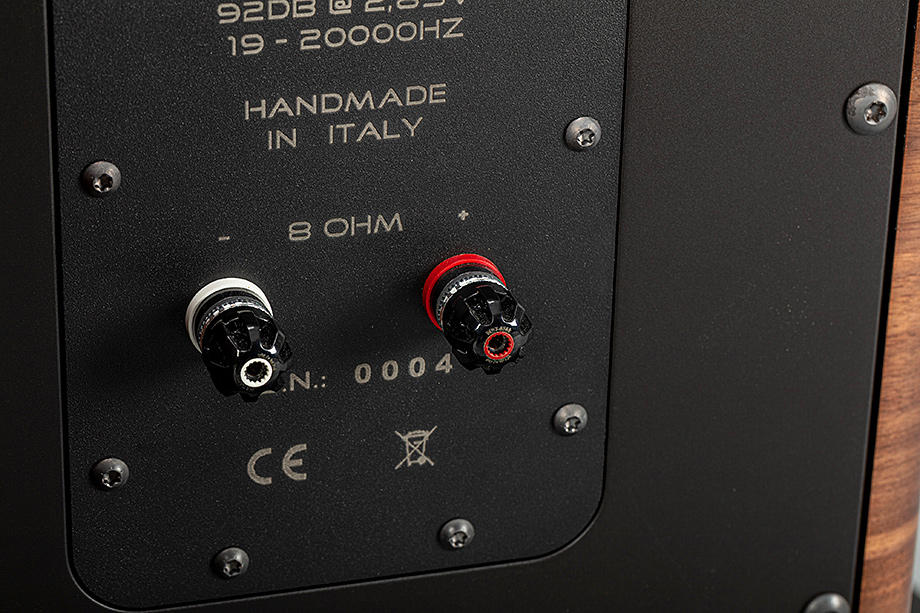 A skoro wspomnieliśmy już o głośniku wysokotonowym, dopowiedzmy, że jest to głośnik tubowy, przypominający konstrukcje estradowe; to przetwornik kompresyjny. Membrana jest w nim obciążona tubą. Swego rodzaju „tuba” jest również obciążeniem większych głośników. To pomysł Grandinote, mający mieć zalety zarówno linii transmisyjnej, jak i systemu bas-refleks i osi nazwę S.R.T. (Semi Resonant Tube). Jej wylot znajduje się na tylnej ściance, tuż przy podłodze, i ma postać dwóch szczelin. Kolumny przykręcono do grubych, dość prostych w formie aluminiowych platform, do których wkręcamy trzy kolce – dwa z przodu i jeden z tyłu. Ponieważ wylot S.R.T. znajduje się tak nisko, ważne będzie, jak mocno je wykręcimy. Producent zaleca, aby szczelina między platformą i podłoga była jak najmniejsza. Obudowy wykonano z grubych paneli MDF polakierowanych na czarno. Są one dostępne z kilkoma wersjami oklein bocznych paneli. Sygnał wyprowadzany jest za pomocą pary zacisków WBT, takich samych, jak we wzmacniaczu Solo.