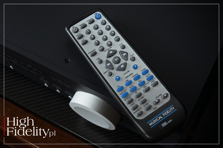 Jedną z ważniejszych funkcjonalności współczesnych przetworników cyfrowo-analogowych jest możliwość zmiany filtrów cyfrowych. Początkowo przyjmowano tego typu rozwiązania nieufnie, zwracając uwagę na – jak mówiono – pomijalny wpływ takich zabiegów na dźwięk. Z czasem, kiedy filtry, o których mowa, stawały się coraz bardziej wyrafinowane, zaakceptowano ich wybór jako coś naturalnego. W testowanym przetworniku mamy do wyboru siedem filtrów oraz, pod numerem osiem, możliwość wyłączenia oversamplingu i przesyłu sygnału bezpośrednio do filtra IIR w DAC-u ESS. Sygnał PCM jest wówczas upsamplowany w układzie XMOS do postaci 352,8 lub 384 kHz. Producent mówi, że przez wyłączenie oversamplingu zasilanie układu DSP wymaga mniejszych prądów, a przez to minimalizowane są szumy, w innych przypadku dodawane do sygnału użytecznego. Filtry te nie działają przy sygnale DSD i MQA, które mają własne filtry. W tym drugim przypadku filtry te zostały zaprojektowane z inżynierami MQA i zaaplikowane w układzie DSD przetwornika. I jest jeszcze pilot zdalnego sterowania. Pilot o którym wolałbym zapomnieć. Jest brzydki, mało poręczny i zatłoczony do granic możliwości. Jego jedyną zaletą jest to, że jest systemowy, obsłuży więc inne urządzenia Musical Fidelity, nie tylko z serii M8. ▌ ODSŁUCH JAK SŁUCHALIŚMY • Przetwornik cyfrowo-analogowy Musical Fidelity M8x DAC testowany był w systemie referencyjnym HIGH FIDELITY i porównywany do sekcji D/A odtwarzacza SACD Ayon Audio CD-35 HF Edition, który pracował również jako transport. Równolegle wykonałem odsłuch przy pomocy odtwarzacza plików Lumin T3, pracującego jako transport plików. M8x DAC testowany był z wyjściami RCA (niezbalansowanymi), ponieważ w moim systemie korzystam z kabli RCA.