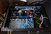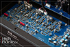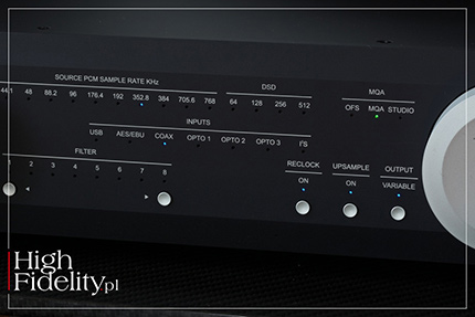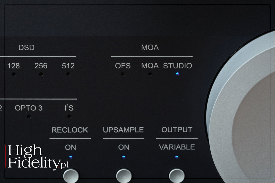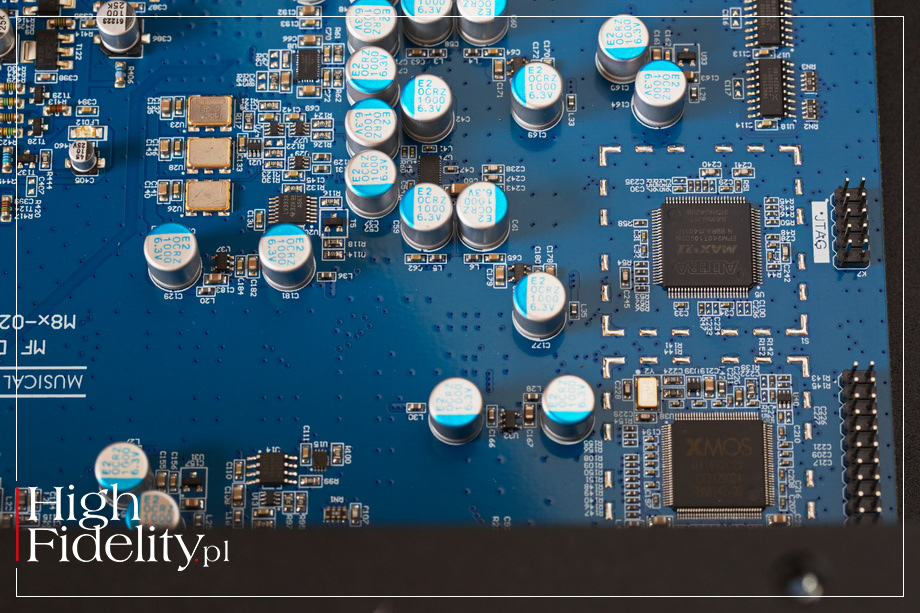 PRZÓD I TYŁ • Dążąc do optymalizacji kosztów – nie mylić z tym, co się dzieje obecnie w USA, a co jest po prostu korporacyjnym piekłem, nie zrezygnowano przy tym z aluminiowej obudowy skręcanej z osobnych elementów oraz z grubej ścianki przedniej, również z aluminium. Odcinają się na niej dwa duże też aluminiowe, pokrętła, a w czarnej wersji również guziki – i jedne, i drugie w obydwu wersjach kolorystycznych mają kolor srebrny. Front rozświetlany jest wieloma diodami LED, niemal wyłącznie niebieskimi. Uwagę zwracają dwa gniazda słuchawkowe – 6,3 mm TRS oraz 4-pinowy XLR. Gałka siły głosu nie ma naniesionej podziałki. Tył został podzielony na dwie części, z wejściami cyfrowymi i analogowymi, choć wewnątrz obydwie sekcje znalazły się na tej samej płytce. Wyjścia analogowe są wysokiej klasy, złocone. Złocone są też wejścia cyfrowe, szkoda więc, że gniazdo RCA jest wyraźnie gorszej jakości niż te w części analogowej. Patrząc od lewej mamy wyjścia analogowe, RCA i XLR, a następnie dwa gniazda wyzwalaczy (trigger), którymi można włączać urządzenie i je wyłączać w systemie. Później w kolejności są to gniazda: HDMI, trzy optyczne Toslink, RCA oraz XLR (AES/EBU) i USB. Na końcu mamy gniazdo zasilające IEC. ŚRODEK • Układ elektroniczny podzielono na dwie części z dodatkowymi płytkami drukowanymi dla diod LED. Bliżej tylnej ścianki znalazła się płytka audio. Na wejściu umieszczono da duże układy cyfrowe, XMOS oraz Altera Max II, pracujące jako odbiorniki cyfrowe, konwerter sygnału USB na IIS oraz filtry cyfrowe. Stąd sygnał trafia do dwóch przetworników D/A ESS Technology ES9038Q2M, po jednym na kanał.