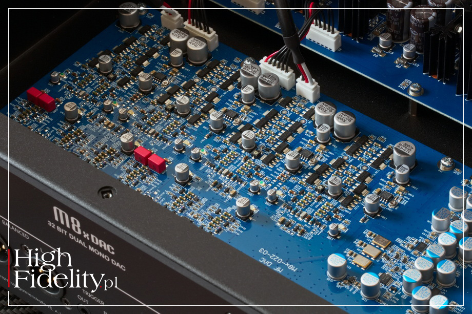 Przetworniki te pracują w trybie różnicowym i układ analogowy jest w całości zbalansowany. Tak naprawdę to są tu dwa osobne układy, dla wyjść analogowych i dla wzmacniacza słuchawkowego, wyglądające tak samo. Układ ten pracuje w klasie A i oparty jest wyłącznie na tranzystorach – montowanych powierzchniowo parach komplementarnych BCP52 + BCP55, czyli tranzystorów bipolarnych. Na wyjściu widać dwa układy scalone TL071 oraz T072, które dbają o to, aby nie pojawiło się na nim napięcie stałe (DC offset). Do wyjść słuchawkowych sygnał prowadzony jest dwoma ekranowanymi interkonektami Van Damme z serii Tour Grade Classic XLR z miedzianymi, srebrzonymi przewodnikami z miedzi OFC. To założona w 1987 roku w Londynie firma specjalizująca się w produktach scenicznych i studyjnych. Wśród artystów korzystających z jej kabli wskazuje się na: Adele, Arctic Monkeys, Coldplay, Foo Fighters, Iron Maiden, Muse, Radiohead. Osobna płytka przypadła zasilaczowi. I to w jego przypadku widać, jak ogromną zmianę przeszły układy elektroniczne w audio w ostatnich dwudziestu latach. Przez lata małe firmy przekonywały, że to kluczowy element układu i że należy zasilać osobno wszystko, co tylko się da. Jak widać, nawet „duzi” się uczą, a zasilacz w M8x DAC jest tego dobrym przykładem. Jego podstawą jest pojedynczy, średniej wielkości transformator toroidalny, ale z pięcioma uzwojeniami wtórnymi. Wygląda na to, że jedno z nich przeznaczone jest do zasilania sekcji cyfrowej, ma osobne diody prostownicze, a pozostałe cztery do sekcji analogowej – osobno lewego i prawego kanału oraz osobno wyjść analogowych i wzmacniacza słuchawkowego. Transformator jest ekranowany metalową puszką. ● ▌ Dane techniczne (wg producenta)