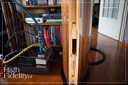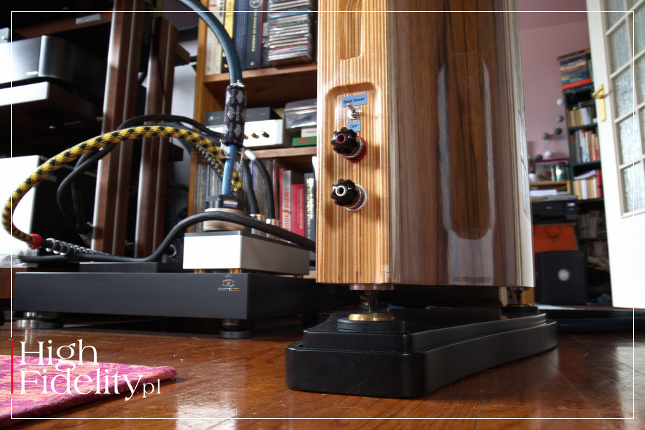 Ich nowa wersja ma się charakteryzować łagodnym opadaniem pasma bez wyraźnych rezonansów poza pasmem przenoszenia. Tradycyjnie membrany głośników Accutone były usztywnione przetłoczeniami w kształcie plastra miodu i były wypukłe (poza głośnikiem wysokotonowym, który – dla odmiany – był i jest wklęsły). W kolumnach Altai znajdziemy jednak ich wersję z membraną o wklęsłym profilu, ale wciąż z siateczką chroniącą głośnik przed uszkodzeniem. Choć kolumny Altai to duże konstrukcje, ich koncept jest podobny do niewielkich kolumn podstawkowych. Dwuipółdrożna budowa oznacza, w skrócie, że mamy do czynienia z dwudrożnym głośnikiem podstawkowym zintegrowanym z pasywnym subwooferem; „monitor” przetwarza pełne pasmo, a od wybranej częstotliwości wspomagany jest systemem głośników niskotonowych. Sekcja „monitorowa” jest zamknięta w górnej części obudowy, a niskotonowa jest wentylowana. I to wszystko w jednej obudowie. Pasmo dla głośników jest dzielone w zwrotnicy o – jak czytamy w materiałach prasowych – „opatentowanej budowie”. Ma to być „purystyczna, zoptymalizowana pod kątem interakcji czasowych, impulsowych i pola magnetycznego, minimalistyczna konstrukcja” – jak zapewnia szef Ayona. Połączenia wewnętrzne są prowadzone kablami wykonywanymi na zamówienie, z których korzysta również marka Ayon Audio. Sygnał do kolumn doprowadzamy pojedynczymi zaciskami głośnikowymi. To gniazda WBT z serii Nextgen ze złoconymi stykami. Nietypowo, są one umieszczone pionowo, a nie poziomo, ale właśnie taki układ ułatwia podpięcie sztywnych kabli w rodzaju Siltecha Triple Crown. Powyżej zacisków znajdziemy mały przełącznik, którym można podbić część basu lub pozostawić płaskie pasmo; wypróbujemy tę możliwość.