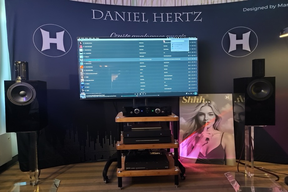 Nie zachwyciła mnie w tym roku prezentacja firmy Daniel Hertz i jej opatentowanej technologii C-Wave. Było poprawnie, ale dźwięk nie kupił mnie tak jak to było w zeszłym roku. W pokoju 102 swoją światową premierę miały głośniki IQ30 firmy Qualio Audio. Zestaw uzupełniała elektronika BonaWatt oraz gramofon Benny Audio.