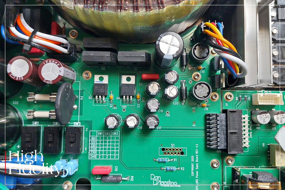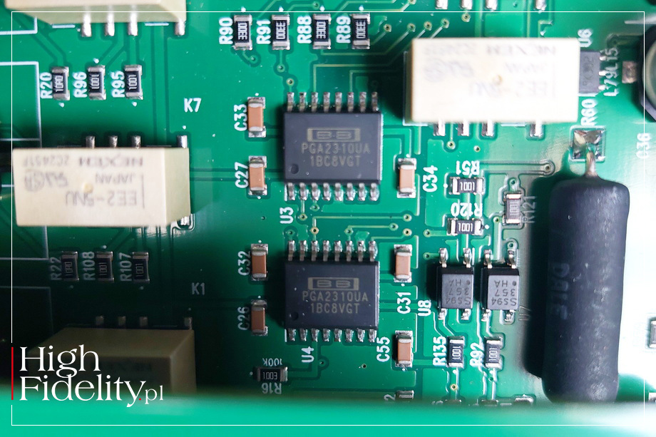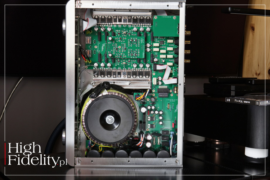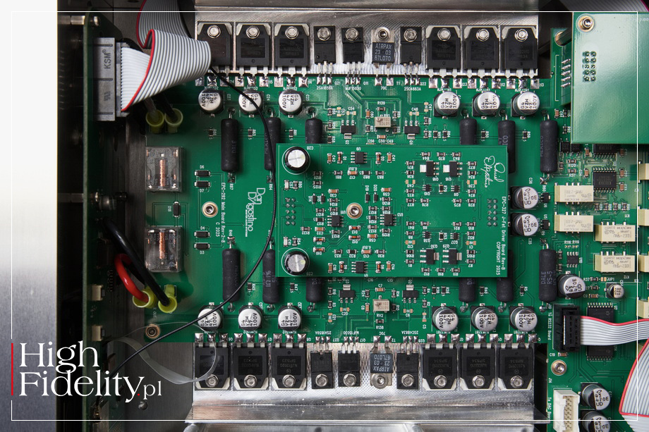 Wprawdzie Pendulum przekroczył to, co się spodziewałem usłyszeć, ale szczere zdziwienie przyszło, kiedy podłączyłem do niego słuchawki. Tak grającego wzmacniacza zintegrowanego w życiu nie słyszałem. W czym przypomniało mi się to, jak kiedyś po raz pierwszy usłyszałem wzmacniacz Leben CS300 ze słuchawkami Sennheiser HD800, a potem Leben CS600X z HiFiMANami HE-1000 v2. Z tym, że amerykańskie urządzenie przeskoczyło nawet te dwa olśnienia. Jego dźwięk, czy to z magnetostateczymi HE-1000 v2, czy dynamicznymi HD800, o których już wspomniałem, ale i – to było genialne połączenie – z dynamicznymi słuchawkami Final DX6000, był wspaniały w nasyceniu, w dynamice i rozciągnięciu pasma. Pozostała plastyka, którą słyszałem z kolumnami, a doszło jeszcze lepsze otwarcie środka pasma i góry, a także jeszcze większa dynamika. Brzmiało to tak, nie żartuję, jak najlepsze słuchawki elektrostatyczne, jakie znam. Gdyby mnie było na to stać, chciałbym mieć Pendulum Integrated w swoim systemie słuchawkowym, byłby absolutną referencją dla dedykowanych urządzeń tego typu. I jedynie topowe propozycje w rodzaju → VIVA AUDIO EGOISTA 2A3 dodałyby do tego lepszą rozdzielczość i swobodę. ▌ Podsumowanie BO TO JEST URZĄDZENIE fantastycznie rozumiejące muzykę. Znam dużą część oferty tego producenta, lubię tę markę i szanuję jej rozwiązania konstrukcyjne. I choć testowany wzmacniacz jest jej najbardziej przystępnym cenowo (czytaj: najtańszym) urządzeniem tego typu, nie wydaje mi się najgorszy. Powiedziałbym wręcz, że jest znacznie lepszy od, testowanego przeze mnie kiedyś, modelu → PROGRESSION INTERGATED, mimo że ten należał przecież do wyższej serii. Nie jest aż tak rozdzielczy, jak stereofoniczna końcówka mocy MOMENTUM S250 MxV, ale różnice są nieznaczne. A tam, gdzie moc testowanego wzmacniacza wystarczy do spełnienia marzeń, wyda mi się on nawet lepszy. Bo bardziej nasycony, a jednocześnie kolorowy. Tak, to najlepszy wzmacniacz firmy Dan D’Agostino Master Audio Systems, jaki słyszałem. To piekielnie drogi wzmacniacz zintegrowany, ale i piekielnie dobry. Docenimy z nim zarówno nagrania, których dawno nie słuchaliśmy, ponieważ uważaliśmy je za „niegodne” naszego systemu, jak i wypieszczone wydania w rodzaju Kind of Blue MIESA DAVISA, płyty wydanej w zeszłym roku na krążku Crystal Disc przez AudioNautes Recordings. Jakość dźwięku zostanie zakomunikowana, ale nie przemocowo, a empatycznie. Jakby wzmacniacz mówił: „Muzyka, głupcze! Bardzo mi się to urządzenie podoba i gdybym nie był dziennikarzem testującym sprzęt, chciałbym mieć u siebie wzmacniacz Dana D’Agostino, ponieważ świetnie wygląda i wspaniale gra. No i jest też pilot, który powinien być w każdym highendowym wzmacniaczu, ponieważ obsługuje się go jak marzenie. Gdyby jeszcze rozwiązać problem jego zasilania, na przykład przez wymienne akumulatorki, byłoby idealny. Od nas wyróżnienie ˻ RED FINGERPRINT ˺ z czerwonym od gorącego serca RED w jego nazwie. ▌ BUDOWA PENDULUM INTEGRATED jest, jak nazwa wskazuje, wzmacniaczem zintegrowanym. Ma czystą ściankę przednią, jedynie z dwoma gałkami, ponieważ część opcji została przeniesiona do menu. Całość jest wykonana z precyzyjnie spasowanych płyt z aluminium wykończonych w taki sposób, aby widać było jej szczotkowanie. We wzmacniaczach tej firmy cechą charakterystyczną są widoczne na zewnątrz radiatory o których materiały firmowe mówią: Venturi Style Heatsinks. Tutaj ich nie ma. Radiatorem jest bowiem cała obudowa. Tranzystory są przykręcone do aluminiowych bloków, a te do dna obudowy. Wzmacniacz pracuje w klasie AB, pomimo wysokiej mocy nie grzeje się więc zbytnio. W końcówce mocy użyto po trzy komplementarne pary tranzystorów bipolarnych NJW3281G + NJW1302G na kanał. Do płytki z nimi wpięto mniejszą, z układem wejściowym. Tam z kolei pracują tranzystory polowe typu JFET. Producent deklaruje, że ta sekcja wywodzi się z przedwzmacniacza Momentum C2 i zwiększa impedancję wejściową, redukując jednocześnie szumy. Urządzenie nie ma globalnego sprzężenia zwrotnego. Układ wejściowy znalazł się na osobnej płytce. To wybierane w hermetycznych przekaźnikach japońskiej firmy Hexhem wejścia oraz dwa, po jednym na kanał, układy scalone z drabinkami rezystorowymi – Burr-Brown PGA2310UA. Jest to stereofoniczny układ scalony firmy Texas Instruments (wcześniej Burr-Brown). Tłumik jest w nim analogowy, a sterowanie nim – cyfrowe. Stosuje się go zarówno w profesjonalnych, jak i konsumenckich urządzeniach audio. Zastosowanie dwóch układów pozwoliło na odseparowanie od siebie kanałów. Wyjście słuchawkowe otrzymało małą płytkę i widać, że to element pomocniczy. Sygnał do niej prowadzony jest taśmą FFC (Flexible Flat Cable). Gniazdo słuchawkowe jest złocone, ale aż prosiłoby się o wykorzystanie zbalansowanej budowy wzmacniacza i zastosowanie zbalansowanego wyjścia, na przykład Pentaconn. Może w wersji „headphone” :)