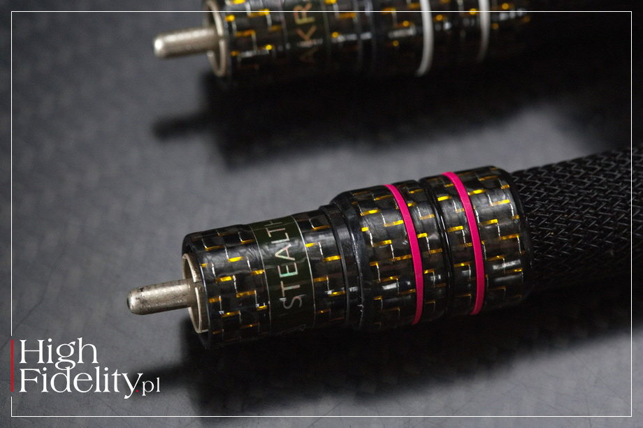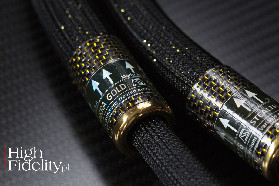 Ale to tylko płaszcze – zewnętrzny i wewnętrzny. Duża część kabla jest bowiem dodatkowo chroniona helem – zamiast próżni czy powietrza, po które często sięgają konstruktorzy highendowych kabli. Jak zapewnia producent, właściwości dielektryczne gazowego helu są znacznie lepsze niż nawet porowatego Teflonu, lepsze niż powietrze i lepsze niż realistyczna (komercyjna) próżnia. Kabel został skonstruowany w formie podwójnej helisy, która pozwala ekranować kabel bez konieczności użycia dodatkowego ekranu. Zwykle tego typu kable są dość sztywne, jednak zarówno Śakra v.16, jak i wersja Gold są bardzo giętkie. Nie jest również ciężki (przewodniki o małym przekroju), co pozwala na jego łatwe użytkowanie. WTYKI • Jednym z elementów charakterystycznych testowanego interkonektu są wtyki. Wykonywane są specjalnie dla Stealth Audio Cables, a ich konstrukcja jest opatentowana. Ma je cechować bardzo niska masa całkowita, przypominająca to, co dostajemy z wtykami Bullet Plug Ecihmanna czy nextgen firmy WBT. Ich styki wykonano z litego srebra i osadzono je w, jak czytamy, „mocno modyfikowanym dielektryku” z PTFE; PTFE = Poli(tetrafluoroetylen), materiał tożsamy z Teflonem, ale sprzedawany nie przez jego wynalazcę, firmę DuPont, a przez innych producentów. Kable są łączone z wtykami nie za pomocą skręcania czy lutowania (to proste, ale niezbyt dobre metody), a przez zaciskanie wysokociśnieniowe czyli spawanie na zimno. Daje to bezpośredni kontakt między nimi, eliminując z równania lut. A lut to w niemal całości cyna, jeden z najgorszych przewodników. Korpus wtyków wykonano z kompozytu kevlarowego, a skorupę zewnętrzną z włókna węglowego i tytanu. Z podobnych materiałów skorzystano przygotowując tuleje spinające grubszą część kabla z odcinkiem z wtykiem. Przypomnijmy, że w kablu zasilającym Dream 20-20 AC pan Timachev dał możliwość „strojenia” kabla właśnie przez tego typu, przesuwaną po nim, tuleję. Wydaje się więc, że i tutaj pełni ona rolę mechanicznego tłumika.