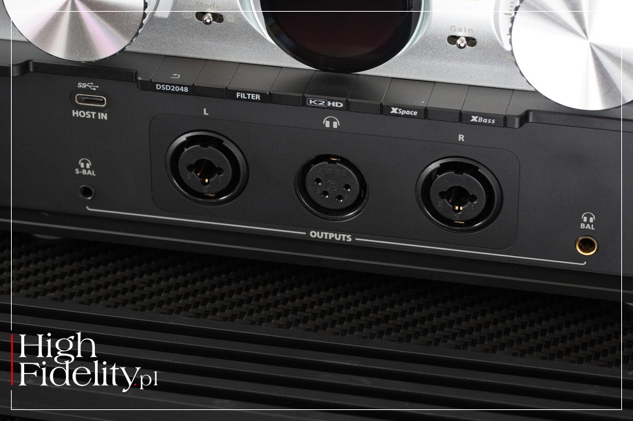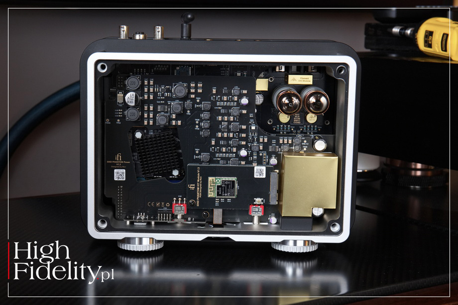 To jedna z technik stojących u podstaw płyt XRCD w wersji XRCD24; więcej → TUTAJ. Aby było jeszcze więcej działań, możemy wybrać starszy układ K2 Technology, stosowany z płytami XRCD lub nowszy, K2HD. To tutaj jest też rozpakowywany sygnał MQA, zarówno z plików, jak i z wejść cyfrowych (na przykład z płyt MQA-CD). Ciekawe, ale logotyp MQA nie pojawia się na wyświetlaczu, a jedynie częstotliwość rozpakowanego sygnału. Osobny układ, Crysopeia FPGA, o którym producent pisze „digital engine”, służy do upsamplowania sygnałów PCM i DSD (DSD Remastering) aż do zawrotnej wartości DSD1024, a nawet DSD2048. Po co? Konwersja sygnału DSD na analogowy jest o wiele łatwiejsza niż PCM, to raz. Dwa – taka zamiana daje o wiele lepszy dźwięk. Historycznie różnie z tym bywało, to nie jest prosty algorytm, ale współcześnie niemal zawsze wybieram tę opcję. Problemem jest duży szum sygnału DSD przy konwertowaniu na analog. Dlatego od lat stosuje się konwertery zwiększające częstotliwość próbkowania – w odtwarzaczu CD-35 Mk II HF Edition sygnał jest zamieniany na DSD256. Wartość DSD2048 widzę po raz pierwszy. Choć w sygnale nie ma dzięki temu żadnych nowych informacji, to jednak – jak pokazywały pomiary wykonane przez magazyn „Stereo Sound”, szumy niemal znikają. Równie ciekawe jest wyjście analogowe. Jest ono zbalansowane i możemy sygnałem wyjść przez gniazda RCA lub XLR. Zostało ono zbudowane z elementów dyskretnych pracujących w klasie A i są to, tak naprawdę, dwa różne układy: lampowy i tranzystorowy. Tego typu mariaż iFi Audio stosuje od lat. A polega on na tym, że użytkownik może wybierać, który układ pracuje w buforze wyjściowym, a nawet je połączyć. W torze lampowym zastosowano bardzo dobre, podwójne triody małej mocy, parowane lampy General Electric 5670, wysokiej klasy wariant triod 6922/ECC88. Są one ekranowane miedzią i dodatkowo owijane teflonową taśmą. Na wyjściu tranzystorowym zastosowano z kolei tranzystory polowe J-FET. Wzmocnienie tego układu możemy zmieniać w trzech krokach – 0, +9 i +12 dB. Regulacja siły głosu odbywa się w scalonych drabinkach analogowych. Jest na to, co oczywiste, nazwa własna. WZMACNIACZ SŁUCHAWKOWY • Technologie, które znajdziemy w sekcji wzmacniacza słuchawkowego zostały wypracowane przez iFi Audio z myślą o wzmacniaczu iCAN. Chodziło o maksymalnie wszechstronny, mocny wzmacniacz współpracujący z niemal wszystkimi stosowanymi obecnie typami wtyków i połączeń. Patrząc na przednią ściankę testowanego urządzenia trudno wskazana obszar, w którym nie udałoby się tego spełnić. iDSD Phantom oferuje bowiem nie mniej niż sześć wyjść słuchawkowych, z których trzy są zbalansowane, dwa niezbalansowane i jeszcze jedno, które jest z natury niezbalansowane, ale ma na wyjściu układ zmniejszający zniekształcenia. To: