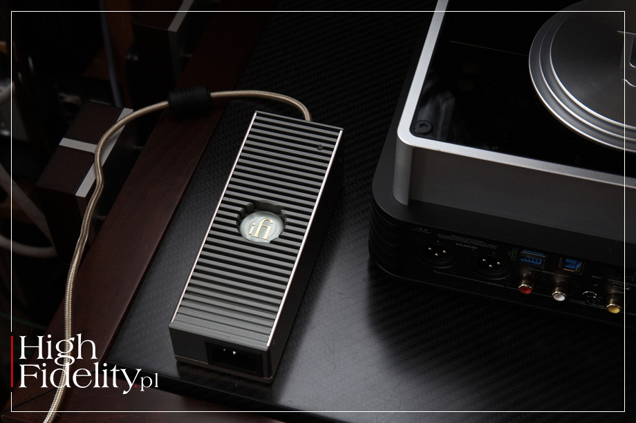 • 2 x 3-pinowe zbalansowane XLR (L/R), Urządzenie potrafi napędzić chyba każde słuchawki dostępne na rynku (poza elektrostatycznymi, dla nich jest przeznaczony model iCAN), a to dzięki wysokiej mocy wyjściowej. Na jego wyjściach otrzymamy bowiem 4,676 mW RMS i aż 7,747 mW moc maksymalnej (to prawie 8 W!). Gdy gniazda nie są używane, można je ukryć za schludnym, mocowanym magnetycznie, panelem aluminiowym. iDSD jest zasilany z zewnętrznego zasilacza, który ma równie atrakcyjny wygląd, jak i sam produkt. Znamy go z wcześniejszych urządzeń tego producenta. Nosi on nazwę iPower Elite, a firma mówi o nim: „Cichy jak akumulator”, czym nawiązuje do – rzeczywiście niskiego – poziomu szumów, który jest deklarowany na <1 μV. Jego podstawą ma być 60-watowy „adaptacyjny kontroler wielomodowy”, a także Active Noise Cancellation II aktywny układ kasujący szumy, oparty – jak czytamy – na technologii wojskowej. I dalej: