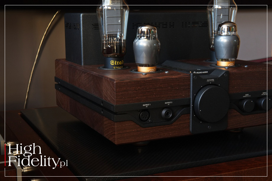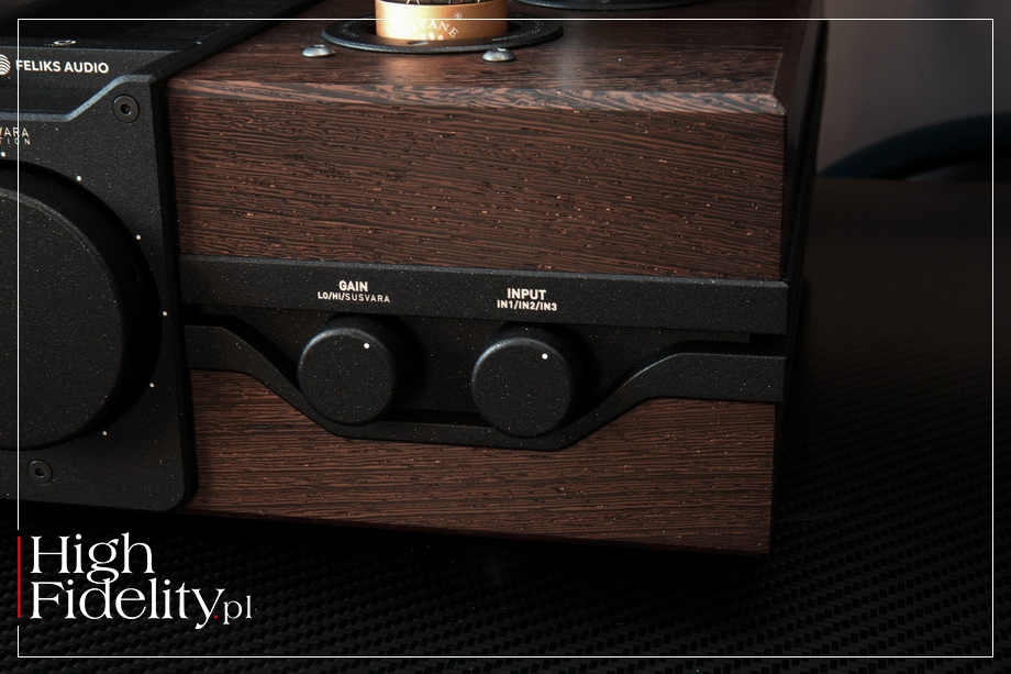 ‖ Feliks-Audio Meisterwerk • zdj. Feliks-Audio Envy Susvara Edition, o której producent mówi „ostateczna wersja”, zaprezentowanej po raz pierwszy podczas targów High End 2025 w Monachium, a pierwsze egzemplarze trafiły do sprzedaży we wrześniu 2025 roku. Jest to najmocniejsza jak dotąd wersja Envy, oferująca moc do 9 W. Susvara Edition oferuje wiele zmian wprowadzonych w edycji Anniversary, takich jak transformatory wyjściowe z rdzeniem amorficznym i komponenty o wyższej jakości, a także zestaw klasy lamp mocy Stradi S300B. ● ▓ Envy Susvara Edition HIFIMAN SUSVARA to słuchawki planarne, magnetostatyczne (ortodynamiczne). Czyli takie, w których płaska membrana porusza się w polu magnetycznym magnesów stałych. To doskonałe konstrukcje, a firma ma wieloletnie doświadczenie w ich projektowaniu i produkcji. Ja sam używam kolejnych modeli tej firmy od czternastu lat. Ich problemem jest stosukowo niska skuteczność, wymagają więc mocnych wzmacniaczy. I właśnie z takim zamysłem powstała wersja Susvara Edition, w skrócie SE, aby wysterować wymagające słuchawki Hifimana o tej samej nazwie. Przy czym nie chodzi o modelowanie dźwięku pod ich kątem. Rzecz w mocy wyjściowej – wersja SE ma większe transformatory wyjściowe i jest mocniejsza niż model podstawowy. Pozwala to lepiej wysterować magnetostaty Hifimana. Ale nie znaczy, że tylko ten model, ponieważ może pracować z dowolnymi słuchawkami. Wzmacniacz Envy SE jest wzmacniaczem słuchawkowym pracującym w klasie A, z transformatorowym sprzężeniem, symetrycznym wyjściem i triodami 300B w stopniu mocy. To sporej wielkości, ciężkie, pięknie wykonane urządzenie mierzące 350 × 330 × 185 mm i ważące niemal siedemnaście kilogramów. Polski wzmacniacz Wygląda naprawdę ładnie, między innymi dzięki połączeniu wysokiej klasy drewna i malowanego proszkowo aluminium. Drewniane, olejowane elementy mogą być wykonane z różnego typu drewna, za dopłatą (na przykład z drewna wenge, pasującego do słuchawek Susvara). FUNKCJONALNOŚĆ • Envy SE z wyglądu przypomina wzmacniacz zintegrowany. Pośrodku przedniej ścianki znalazła się duża, wygodna w obsłudze gałka siły głosu z poręczną skalą. Urządzenie nie ma pilota zdalnego sterowania, będzie to więc jedyna możliwość zmiany głośności. Po prawej stronie umieszczono się dwie mniejsze gałki. Pierwszą zmienimy wzmocnienie układu – do dwóch położeń „Low” i „Hi” w tej wersji doszło też „Susvara”, najwyższe. Drugą gałką zmienimy wejście. Envy oferuje bowiem aż trzy wejścia liniowe, z czego dwa są niezbalansowane (RCA), a jedno zbalansowane (XLR). Urządzenie ma budowę niezbalansowaną – to przecież układ single-ended – ale jest sprzęgnięty transformatorowo, co pozwala na zastosowanie kabli XLR. Transformatory sprzęgające dostarcza szwedzka firma Lundahl. Z kolei wyjście zbalansowane jest symetryzowane w transformatorach wyjściowych.