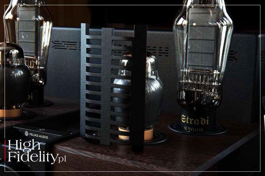 ‖ Po lewej słuchawki Hifiman Suvara, dla których ten wzmacniacz został zaprojektowany; nie znaczy to jednak, że tylko z nimi warto go posłuchać Stradi wyróżnia się na tle innych producentów lamp przez zastosowanie ramy typu drabinkowego (ang. frame grid), która redukuje szumy i mikrofonowanie. Ważną częścią ich konstrukcji są również pomysły, dzięki którym redukowane są straty końcowe żarnika, które mogą powodować dodatkowe zniekształcenia. Sam żarnik jest pokryty powłoką w technice elektroforezy, która utrzymuje stałą temperaturę, co również zmniejsza zniekształcenia. Jak w artykule w PT.Audio pisze Mark Philips, potrójna mika, która była wcześniej stosowana w celu zwiększenia trwałości lamp NOS, jest obecnie wykorzystywana również do zmniejszenia mikrofonowania. Do kontrolowania absorpcji gazu i zwiększenia „lustra gettera”, które decyduje o żywotności lampy, służą do podwójne gettery. Stradi stosuje również bardzo zaawansowany system próżniowy z turbosprężarką – jak twierdzi firma, im wyższa próżnia, tym mniejsze zniekształcenia. Jak czytamy w materiałach firmowych, lampy 300B Stradi zostały zaprojektowane tak, aby naśladować klasyczne lampy 300B, a konkretne modele, takie jak G300B, i są oparte na specyfikacjach modelu STC 4300B. Firma STC (Standard Telephones & Cables Ltd.) rozpoczęła działalność jako brytyjski oddział amerykańskiej firmy Western Electric (WE), stąd w większości materiałów znajdziemy informację o tym, że Stradi to wersje jej lamp. S300B ma oferować unikalne, bardziej „suche” brzmienie, podobne do lamp niemieckich – jak czytamy na jej stronie internetowej, podstawowa struktura została zapożyczona z lamp firm Siemens i Valvo. Jej cechą charakterystyczną jest możliwość wykorzystania pełnej mocy, która dla lamp Western Electric powinna być niższa niż katalogowa. ● LAMPY SĄ WPINANE do ceramicznych podstawek ze złoconymi pinami Nawet ten element wygląda ładnie, a to dzięki napisom na obwódkach wokół gniazd. To przywiązanie do detali, które tworzą coś więcej niż suma ich części, jest zresztą widoczne w całej konstrukcji, nawet w nóżkach. Te są wykonywane samodzielnie i są nóżkami mającymi redukować rezonanse. To konstrukcja ze dość szerokim walcem zakończonym sporej wielkości stożkiem oraz łożem, w odwróconej konfiguracji. Inaczej niż zwykle, nie trzeba się martwić o to, że nie trafimy kolcem do podkładki i zarysujemy stolik, ponieważ kolce są wsuwane do tulei, a ta mocowana jest we wzmacniaczu. Montaż układów elektronicznych wykonywany jest ręcznie w technice punkt-punkt, czyli najlepszej, ale i najdroższej. Do połączeń wewnętrznych wykorzystano kable miedzianymi przewodami UPOCC (Ultra Pure Ohno Continuous Cast) w izolacji teflonowej. W zasilaczu pracują tranzystory MOSFET i niskoszumowe źródła prądu dla napięć anodowych, ze stabilizowanym napięciem żarzenia prądem dla lamp mocy. Specjalnie dla lamp 300B opracowano układ, w którym rozdzielono je od napięcia katodowego.